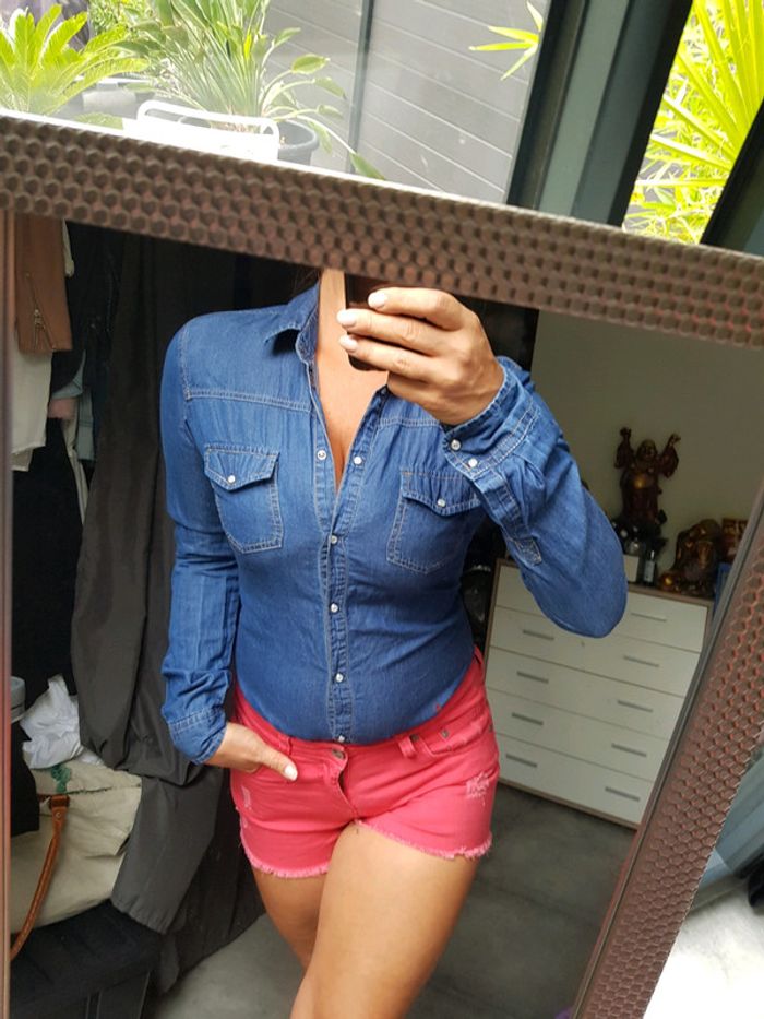 Chemise jeans bleu cintré bouton pression.jennyfer taille S 34.36 porté 2.3 fois