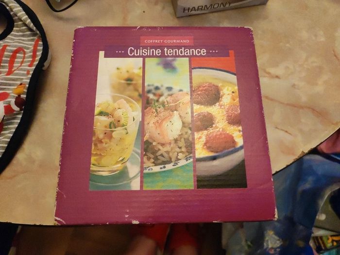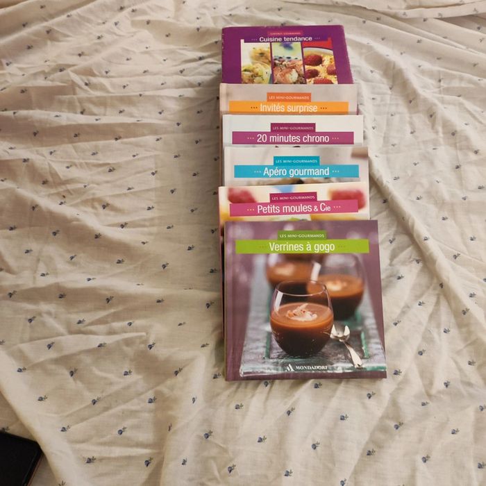 Livre de cuisine au nombre de 5 : 1:petits moules&cie 2:verine à gogo 3:apéro gourmand 4: 20 minutes chrono 5: invités surprises Livres en parfait état (carton usée) Maison non fumeur Possibilité de discuter