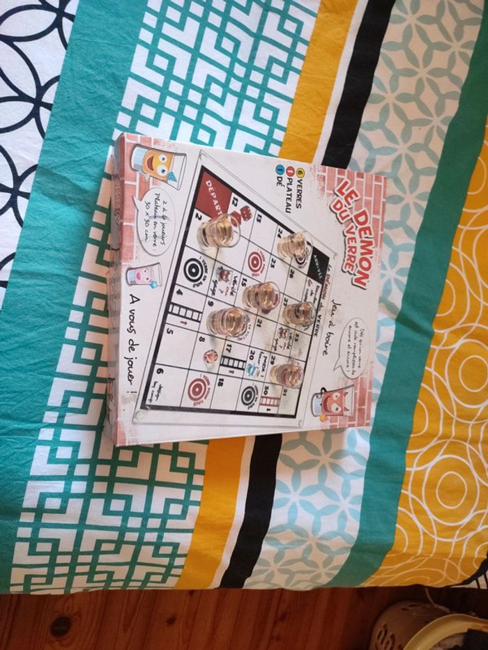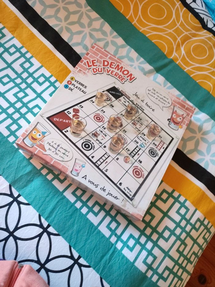 Jeu le démon du verre Idéal pour les soirées entre amis Il n'y a plus les petits vers, juste le plateau et la boîte, très bon état il suffit de rajouter des petits verres achetés dans le commerce pour pouvoir jouer.