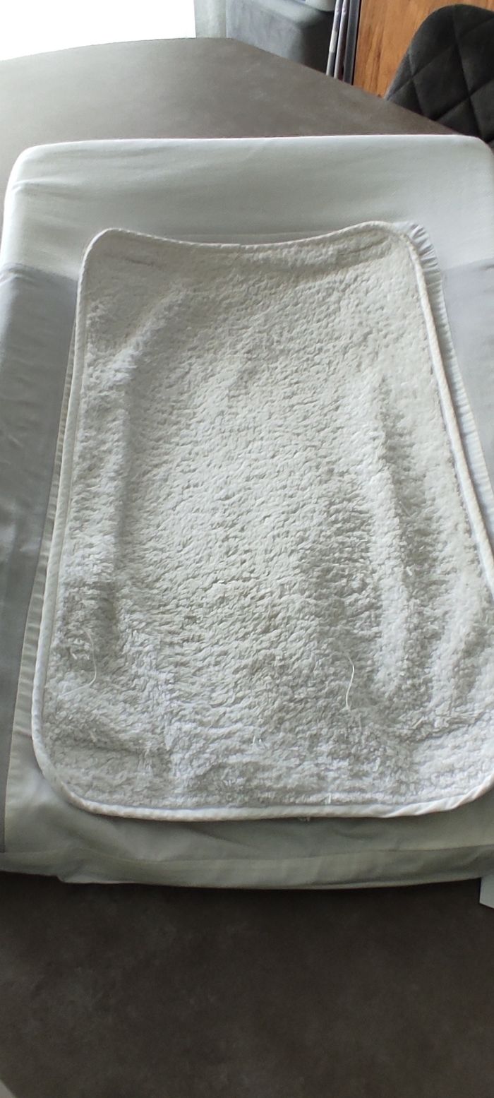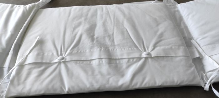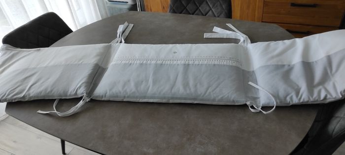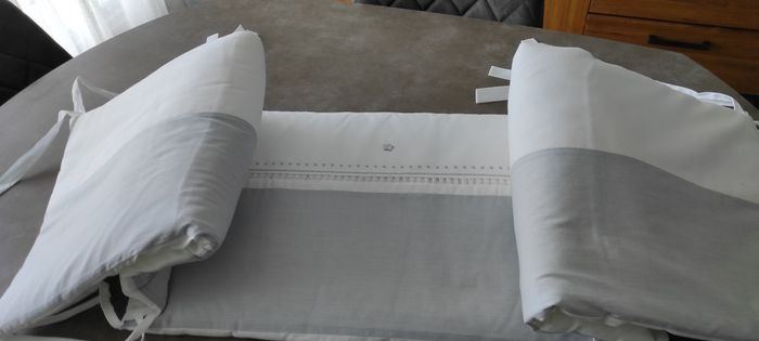 Tour de lit et matelas à langer tartine et chocolat modèle "songe". Très bon état, il n'y a que le petit lange en éponge attaché par du velcro qui a jauni. Possibilité de le changer .