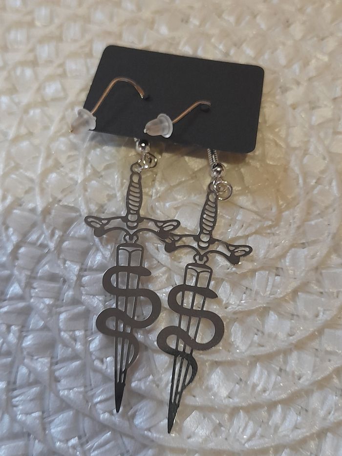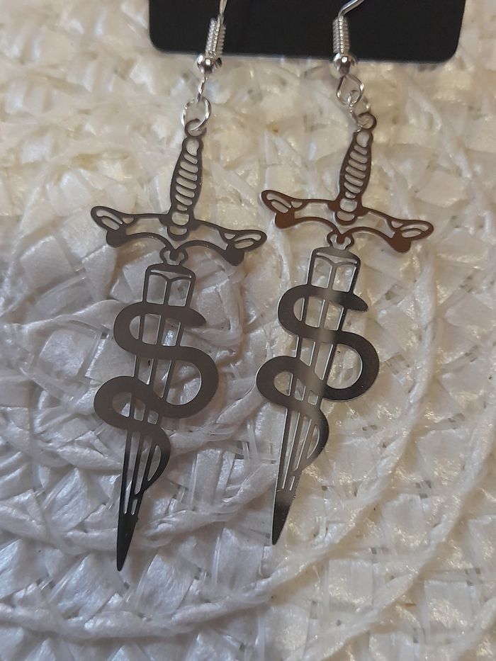 Paire de boucle d oreille artisanal epée avec serpent en acier inoxydable fin mode ,tendance, fashion, kawai, cadeau, offrir, bijoux, serpent ,acier