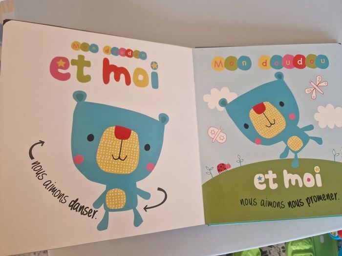 Joli livre cartonné pour bébé, avec doudou tout doux En très bon état