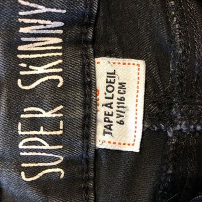 Jean 6 ans : taille vraiment petit, correspondant à un 5 ans Super skinny Très bon état à l’exception d’une tâche à peine perceptible sur une poche arrière (2ème photo)