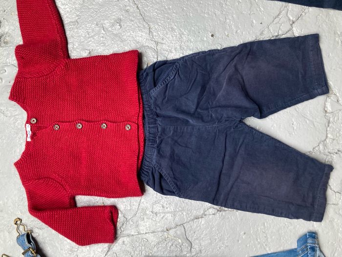 2 pantalons boutchou velours 9 mois: un état moyen et l’autre bon état Un gilet boutchou 12 mois mais taille petit - état moyen 1 pantalon cyrillus 9 mois- tres bon état 2 salopette boutchou - bon état 1 salopette jean Next taille 9-12 mois - tres bon état