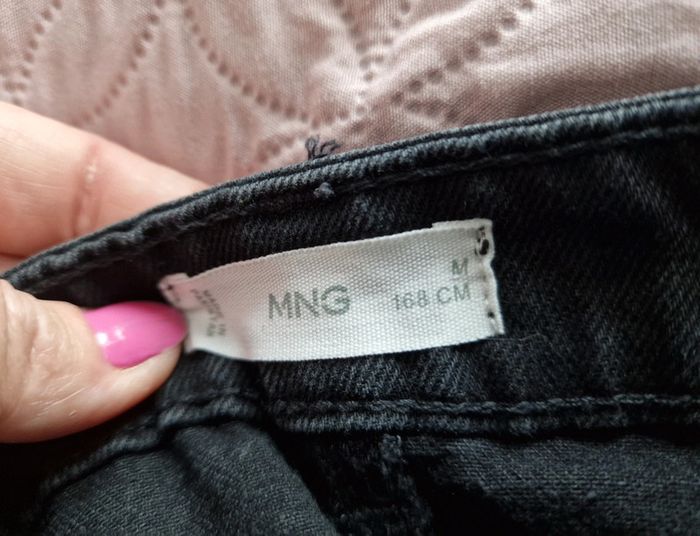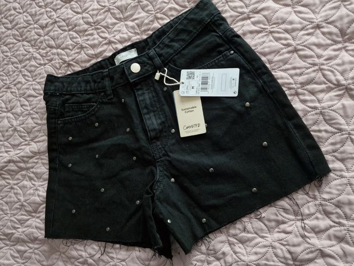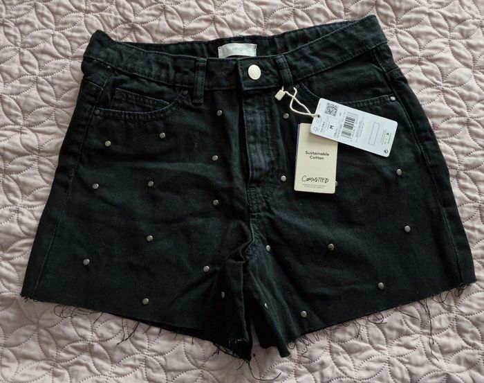 Short en jean femme m 38 MNG noir avec clous , éfilochée dans le bas Mesure : taille 38cm, hanches 46cm, longueur prise sur le côté 33.5cm, largeur bas de short 31cm