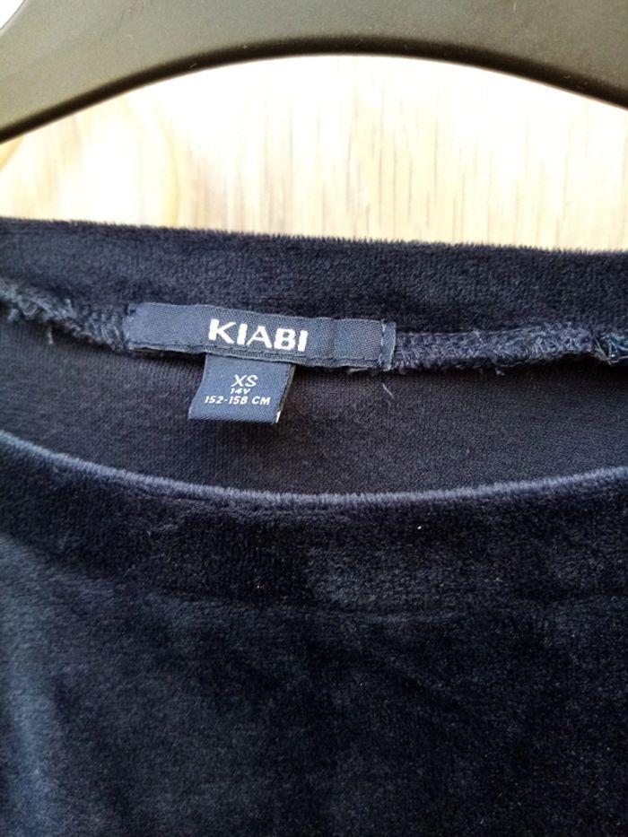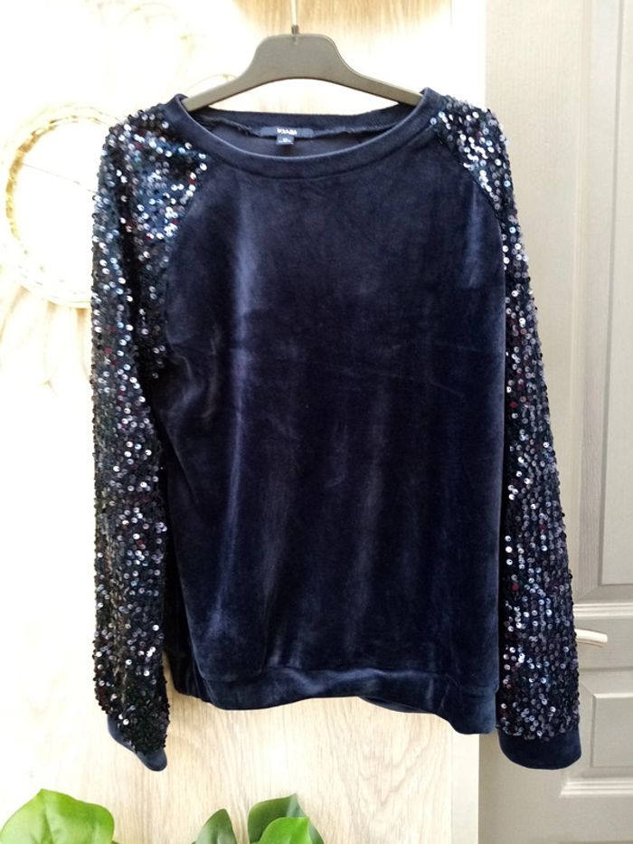 Pull velours + paillettes taille XS (14Y) Très bon état peu mis Sauf élastique retourner en bas ne gêne en rien se voit peu