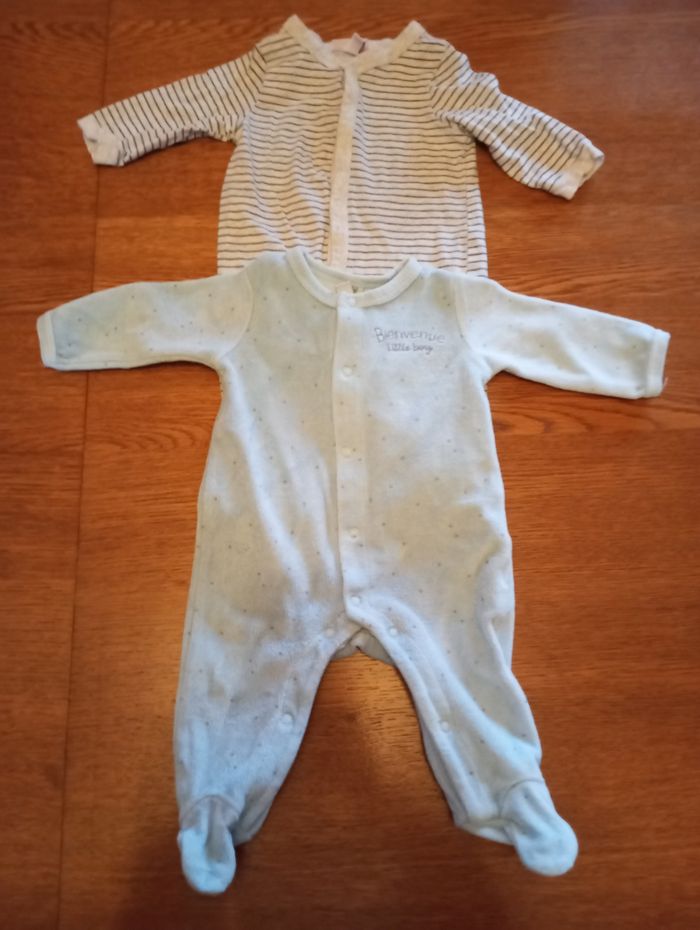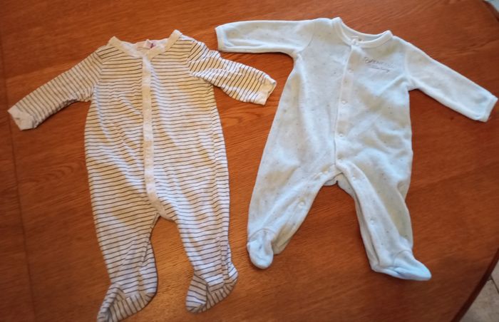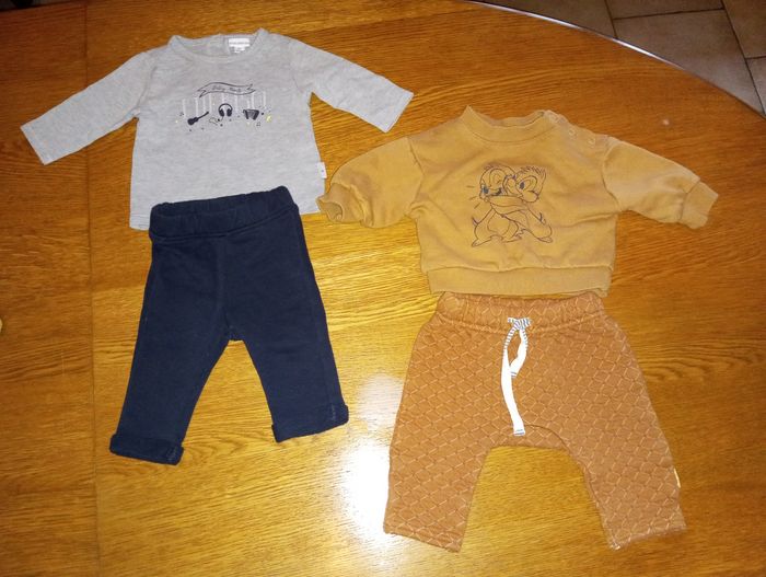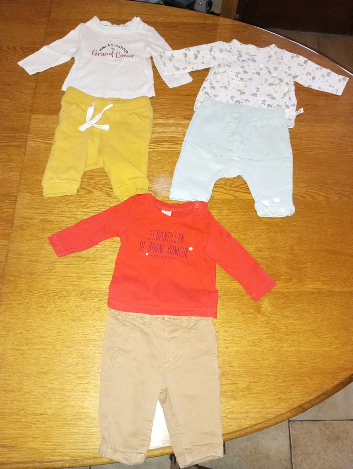 On vend lot de vêtements garçon. Taille 1 mois. En très bon état. Le lot comprend : - 5 pantalons - 5 t-shirt manches longues et pull - 2 pyjamas - 6 bonnets dont 3 taille naissance - 1 paire de moufles
