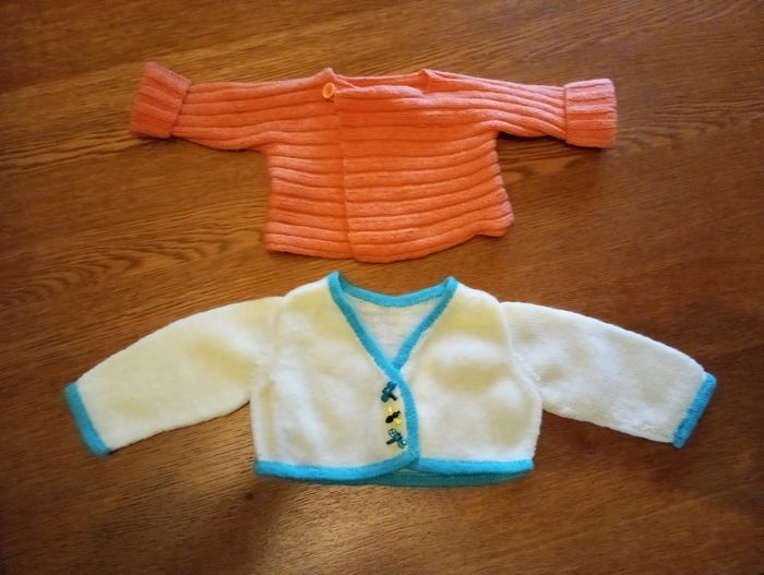 Vend ensemble pour garçon 1 mois/ 2 mois. Le lot comprend : - 1 ensemble salopette neuf porté 1 fois - 2 pulls fait main Très bon état.