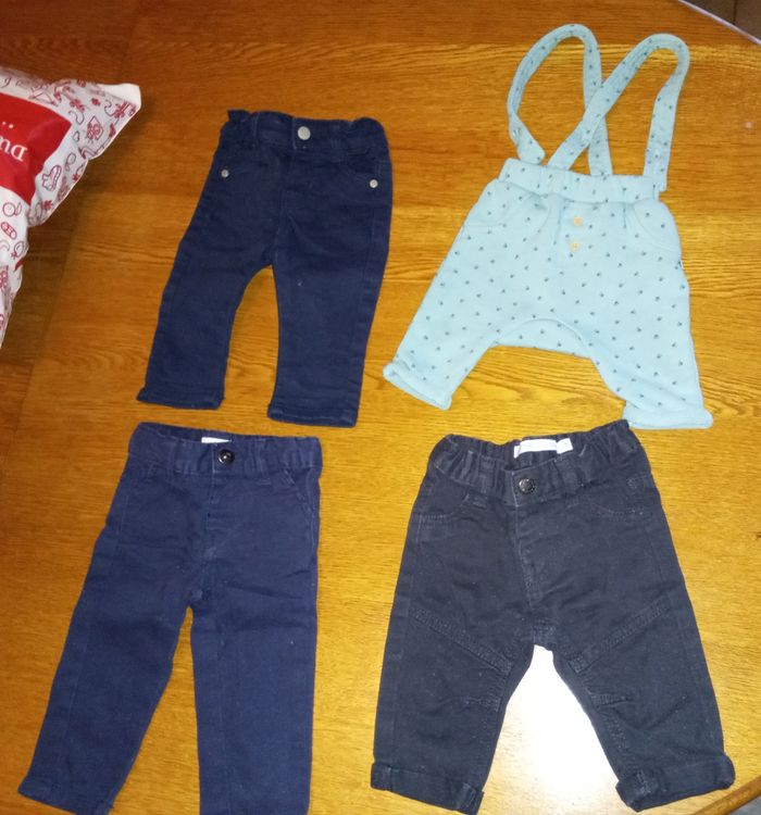 Vend : - 3 pantalons jeans garçon 3 mois - 1 salopette souple - 1 tee-shirt manche longue En très bon état Le tout taille 3 mois.
