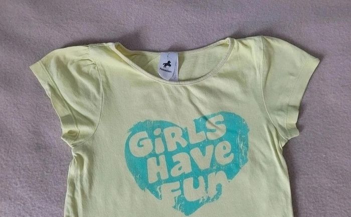 t-shirt manches courtes 128 cm palomino jaune clair motif coeur vert en très bon état