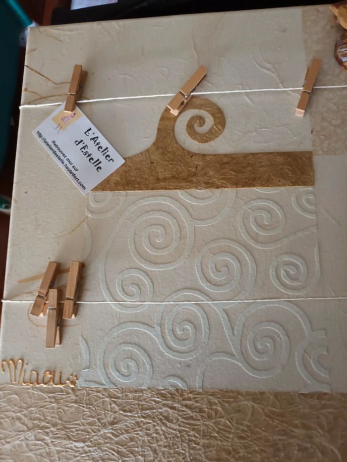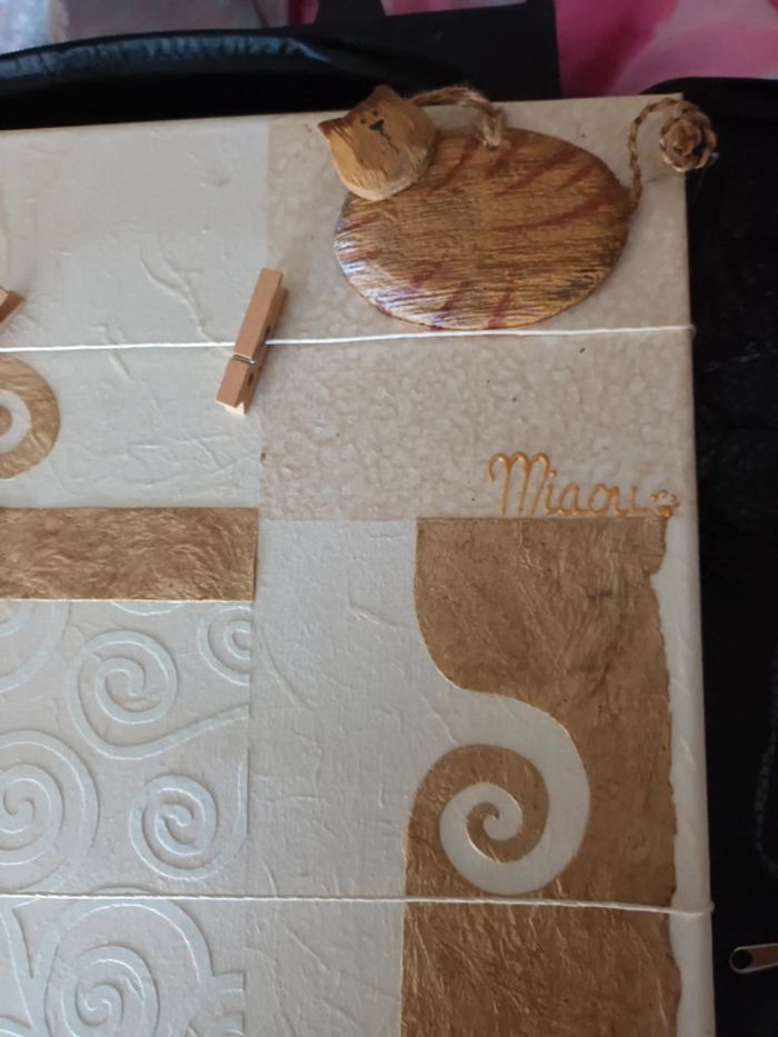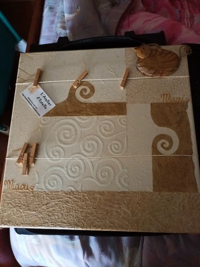 Tableau Pense bête Fait main sur toile Motif chat en bois dans un coin Couleur beige et blanc Très bon etat