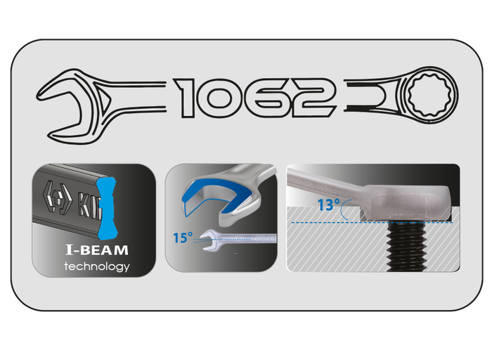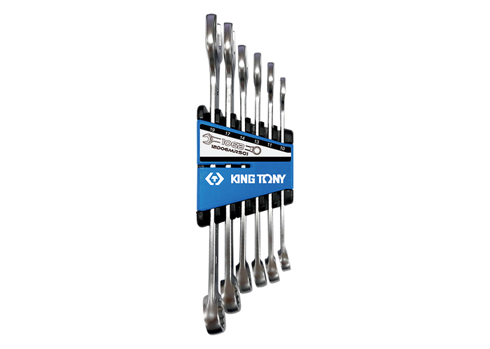 Jeu de 6 clés mixtes sur rack - king tony 12D06MRS01 En étui Fourche renforcée, inclinée à 15° Œil incliné à 13° En acier au chrome vanadium (Cr-V) I-beam : profilé en forme de I inspiré de la technologie des poutres IPN Comprend: Clé mixte métrique (I-beam) de 10, 12, 13, 14, 17, 19 mm Marque KING TONY Référence 12D06MRS01 Outillage Professionnel - Garantie à vie NEUF