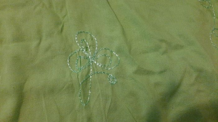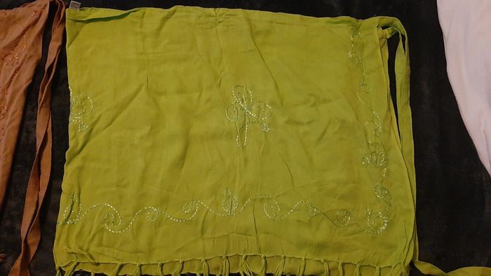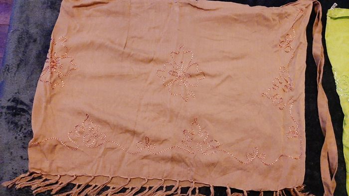 lot de 2 paréos brodés en 100% rayon (soie artificielle) avec franges, un vert pomme, 1 camel, largeur 115cm , hauteur 43cm sans les franges, jamais portés
