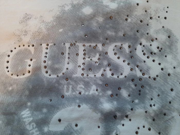 tee shirt fond blanc avec plein de petits brillants, 95% coton, 5% elastan, taille 38, marque Guess Los angeles