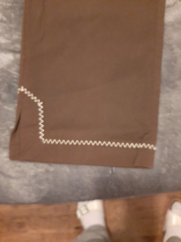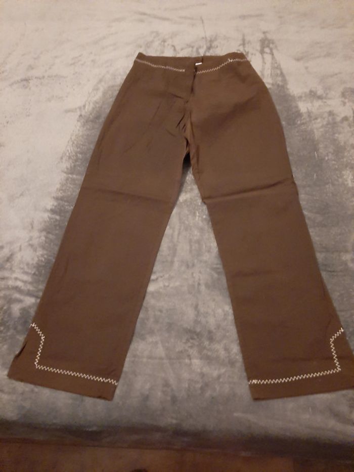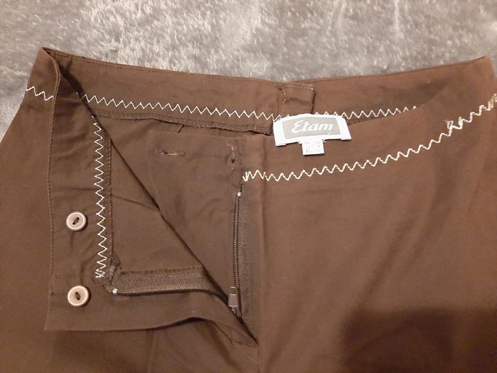 pantacourt coton fin elastiss, zip + 2 boutons, broderie, couleur marron, taille 36, marque Etam
