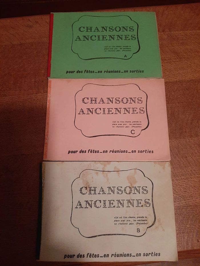 3 fascicules tapés à la machine à écrire et reliés, énorme catalogue de chansons ancienne (170 chansons par livret), rares et anciens