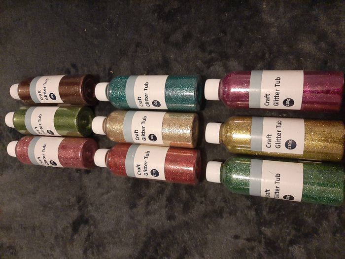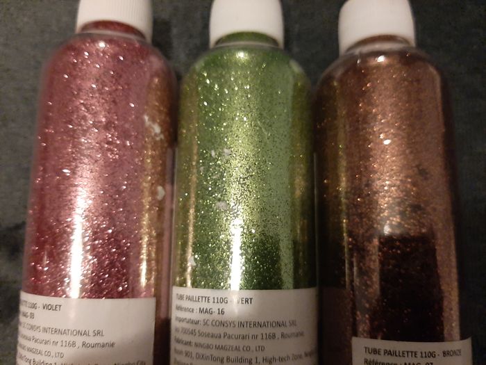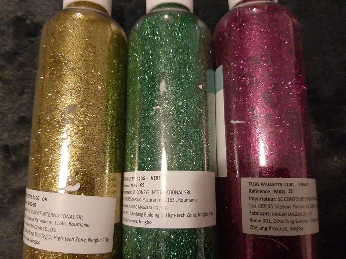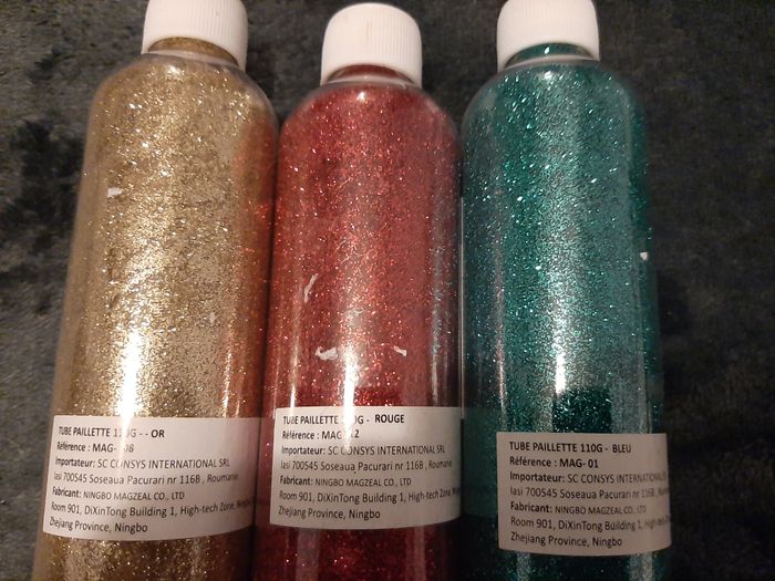 lot 9 pots de paillettes de 110 grammes chacun (hauteur totale 12,5cm),rose violet, vert, bronze, or jaune, rouge, bleu, or, vert gazon, violet, jamais ouverts, marque Craft