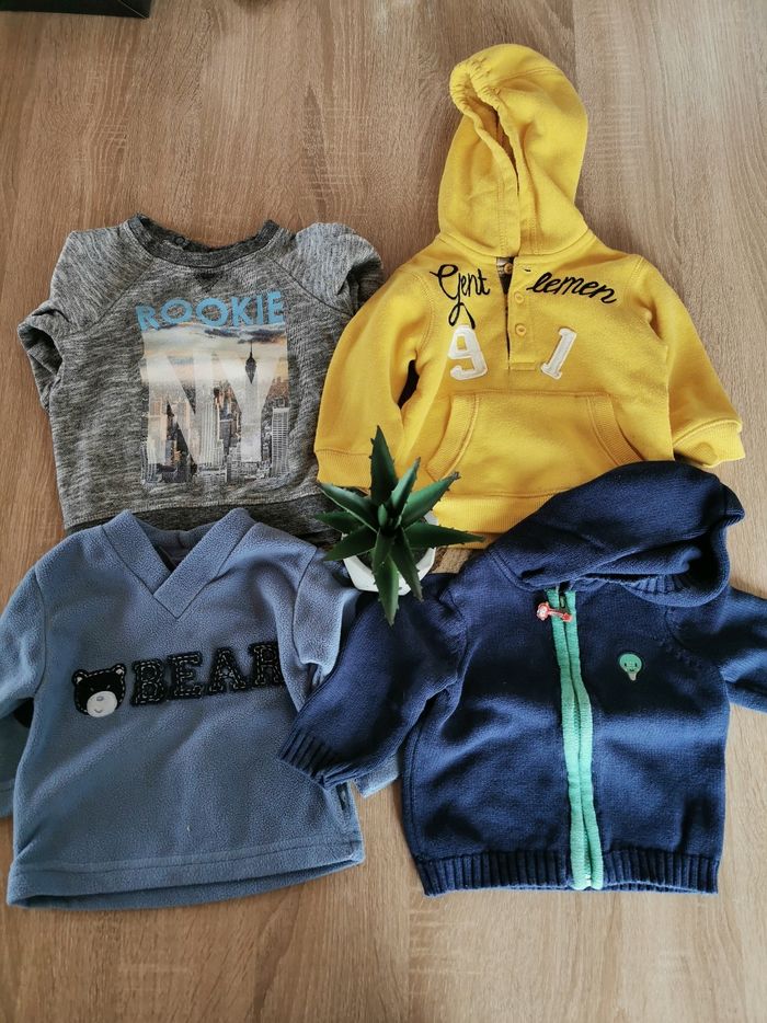 Lot de 4 pull/veste en taille 6 mois, tous en très bon état général voir neuf pour certains. Toutes marques confondus.
