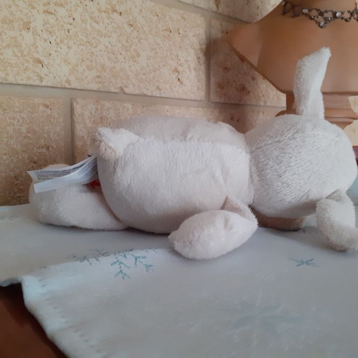 Doudou entièrement; yeux boutons; nez et bouche brodés. Hauteur totale de 24 cm. Coloris beige et écru. Doudou ne tenant pas debout // voir photos pour détails