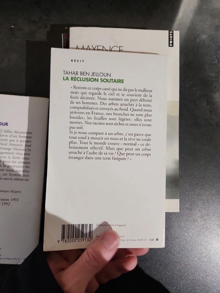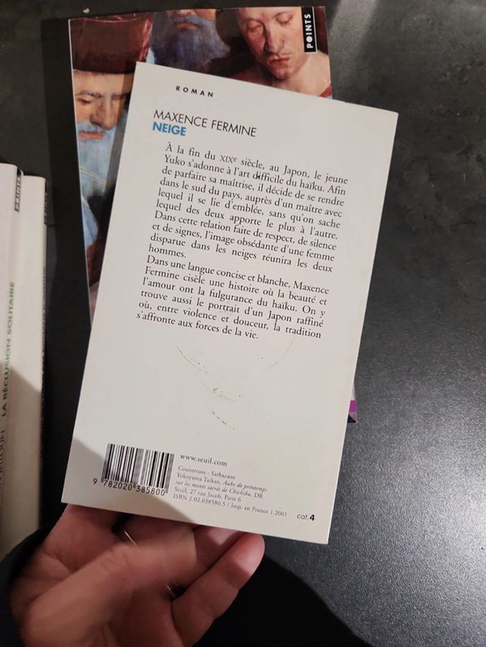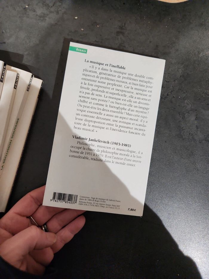1.50 le livres : Demandez 🙂 La musique et l'ineffable Les grecs ont ils cru a leurs mythes La spiritualité du moyen âge occidental Neige La réclusion solitaire Le vieux qui lisait des romans d'amour