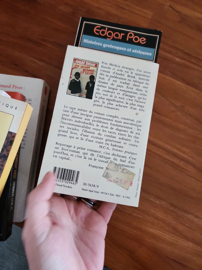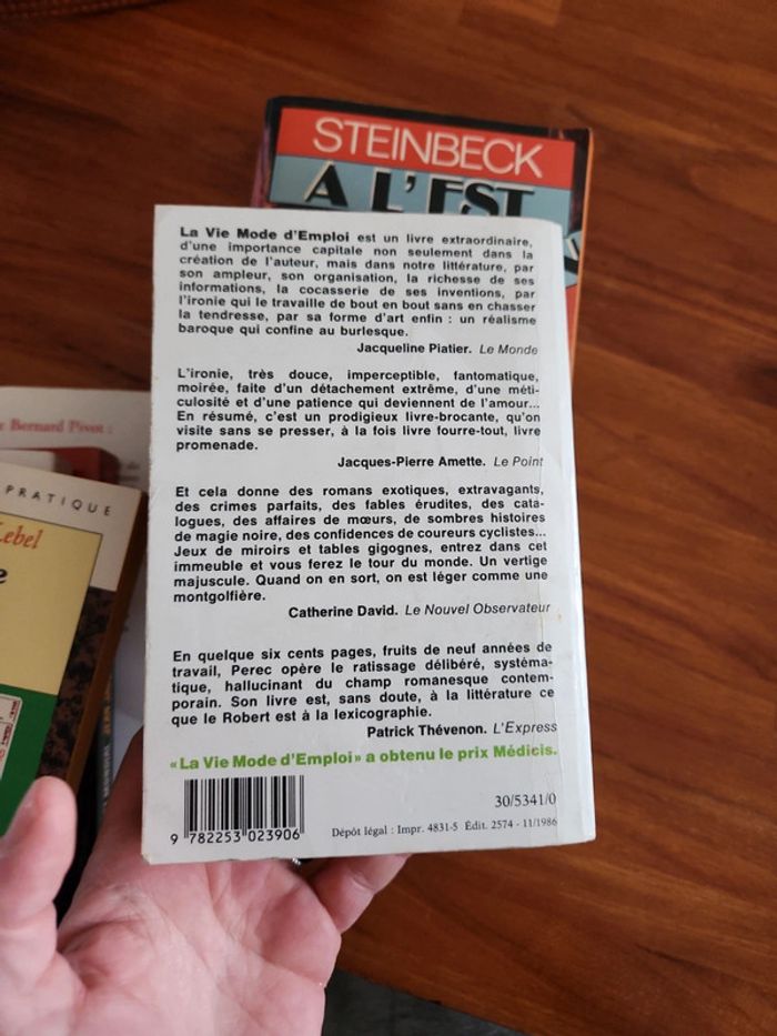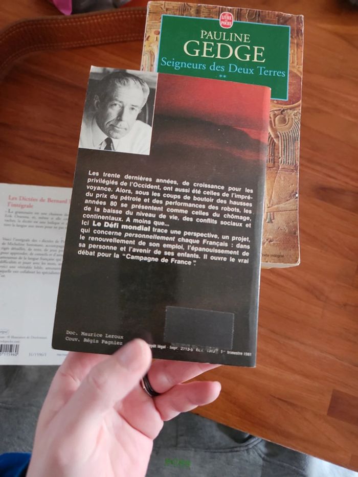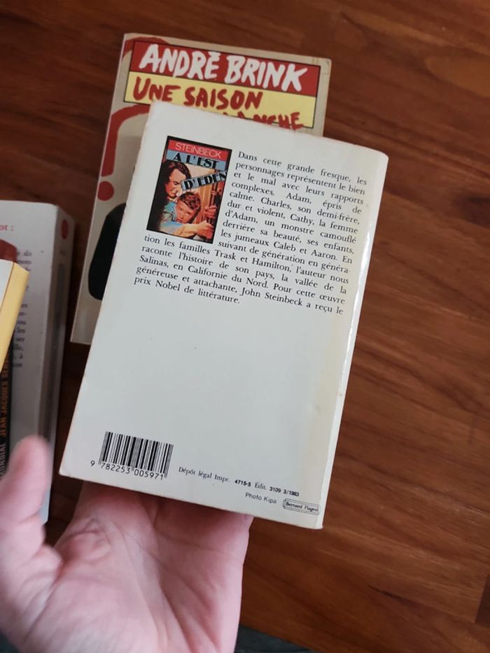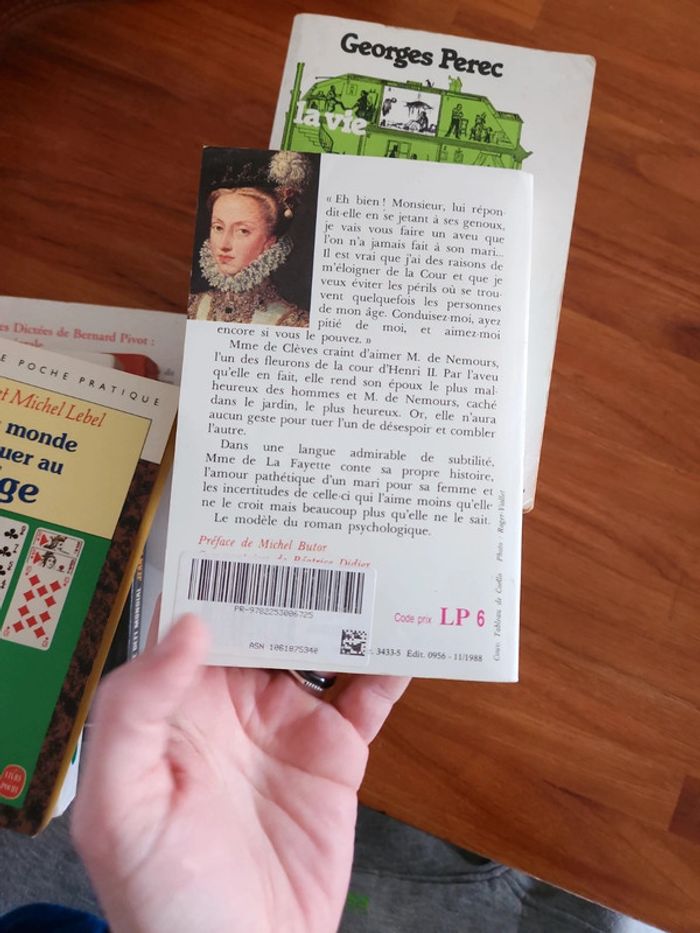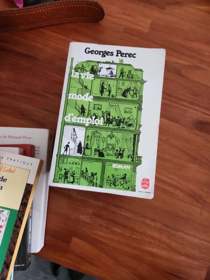 1e le livres / si détail demandez 🙂 Les dictées de Bernard Pivot : L'intégrale Le defi mondial : Jean Jacques Servan Seigneur des deux terres : Pauline Gedge Tout le monde peut jouer au bridge Madame de La Fayette : La princesse de Cleves La vie mode d'emploi : George Perec A l'est d'Eden : John Steinbeck Une saison blanche et sèche : André Brink Histoire grotesques et sérieuses : Edgar Poe Virus : Robin Cook