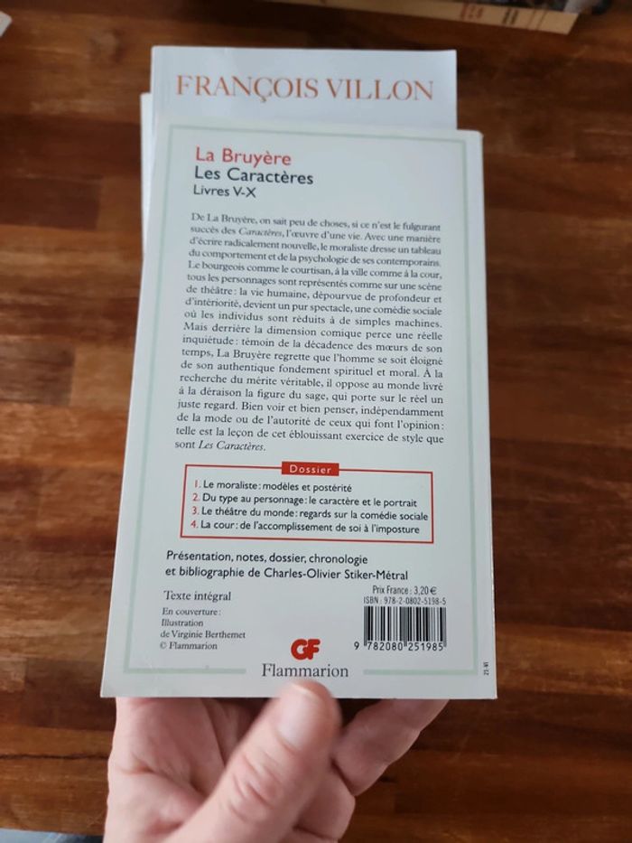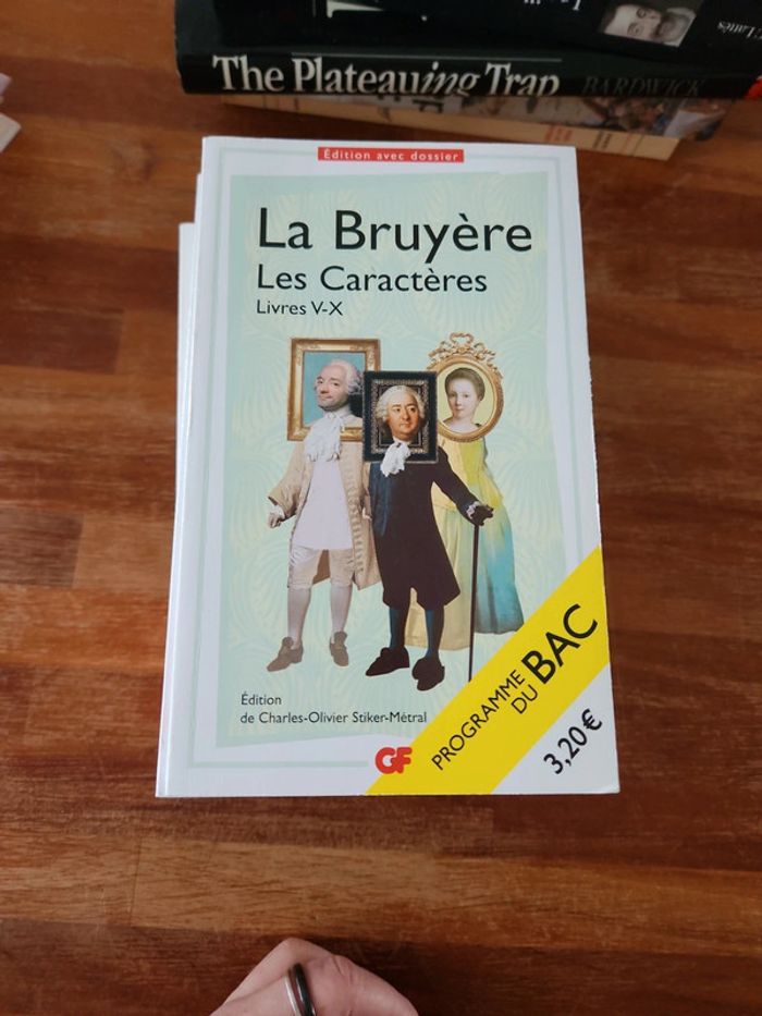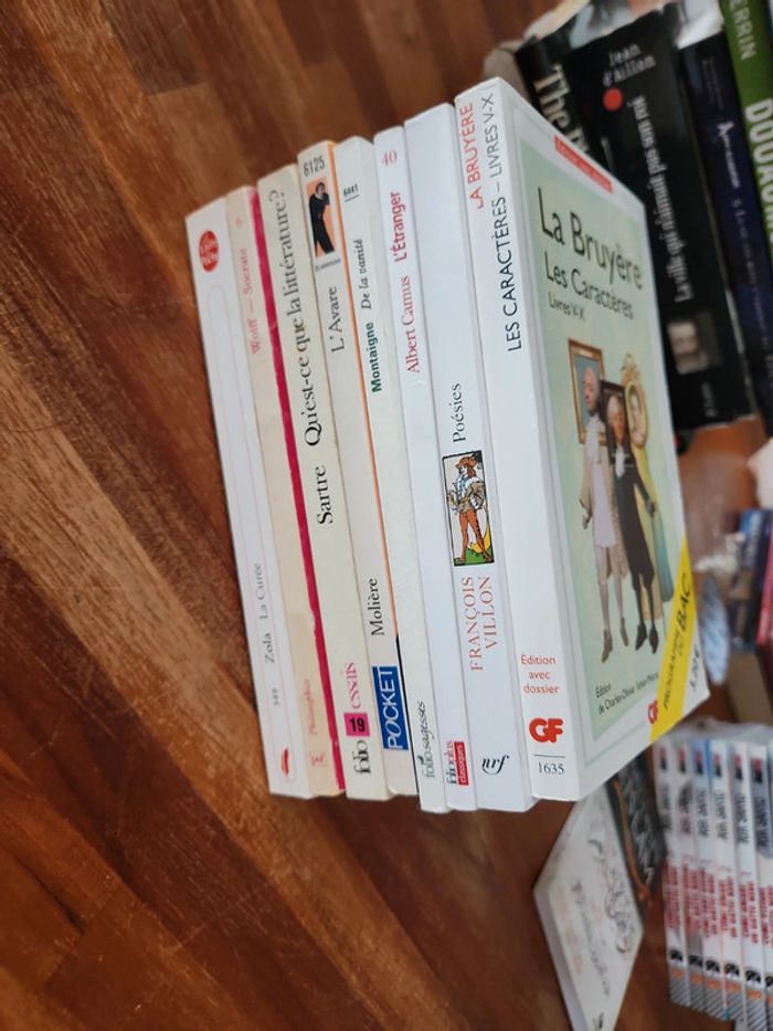 Sartre : qu'est ce que la littérature ? Socrate : Wolff Zola : La curée Molière : l'avare Montaigne : de la vanité Albert Camus : L'étranger La bruyère : les caractères- livre V-X Francois Villon : poésie