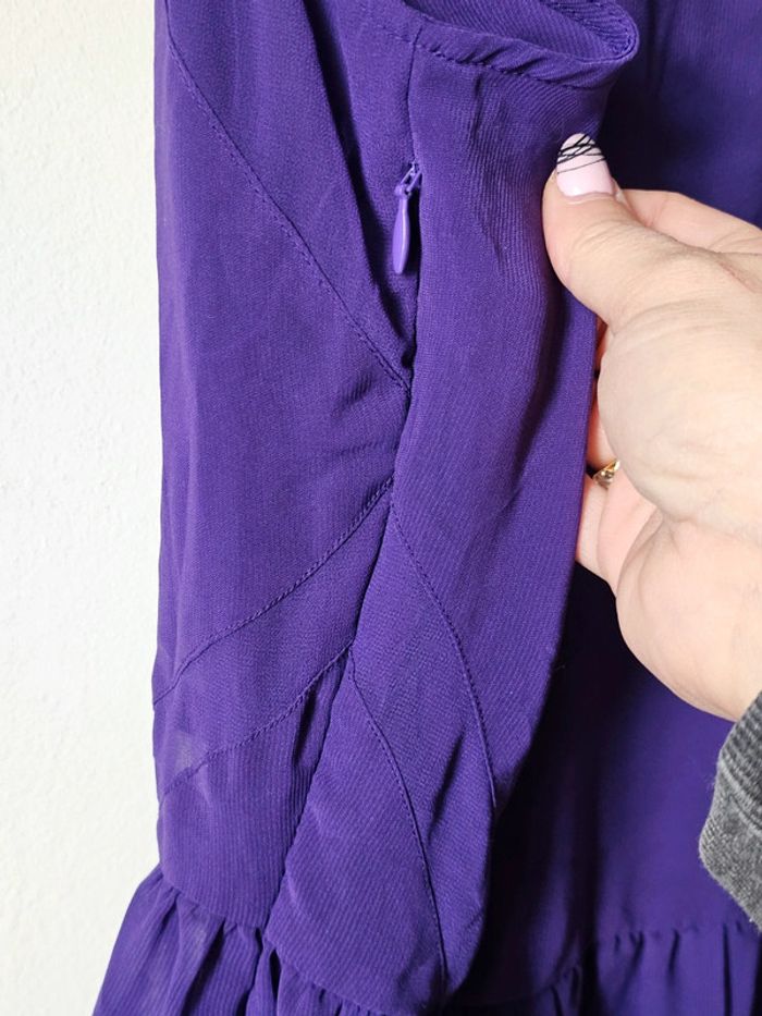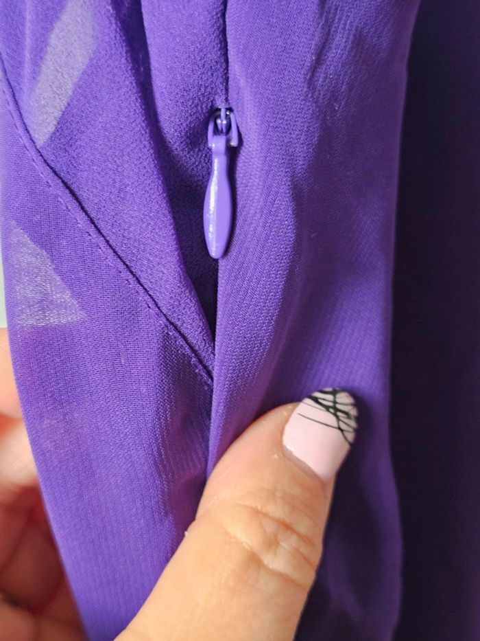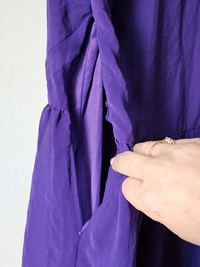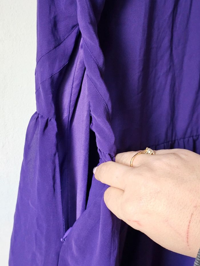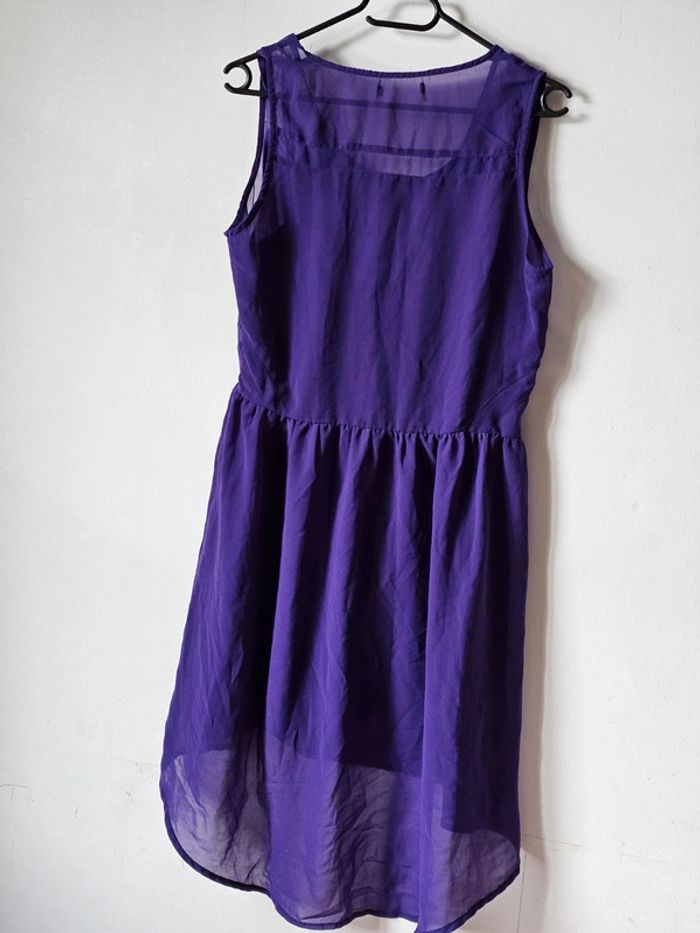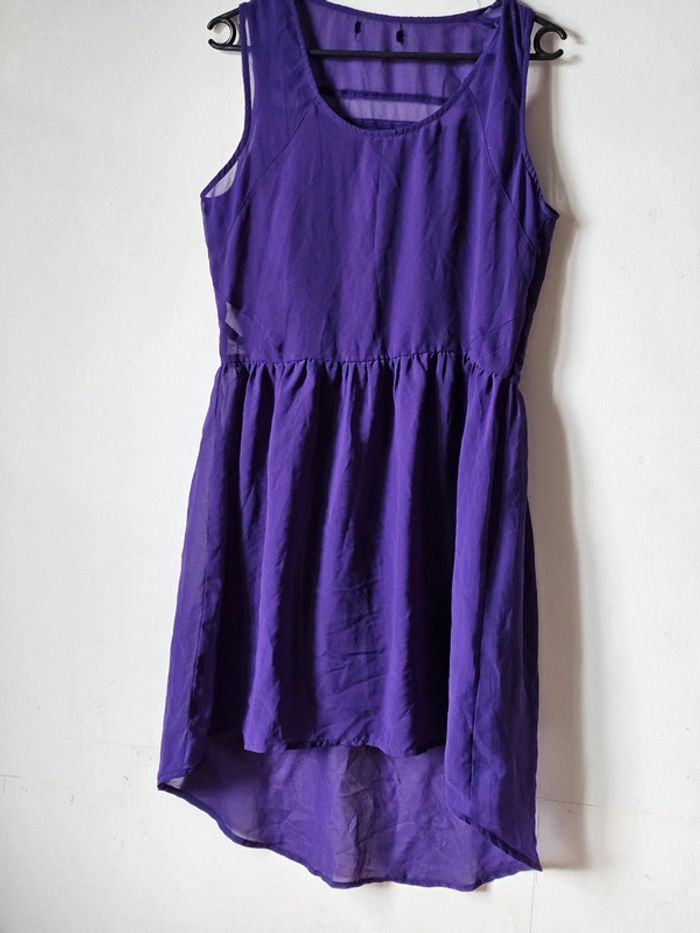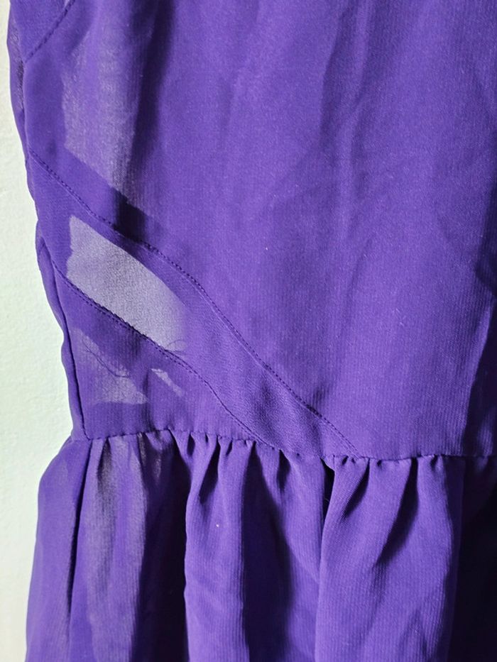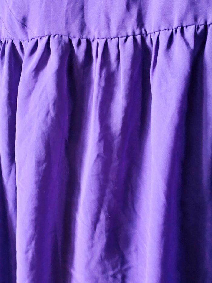 De couleur violette plus longue sur l'arrière Longueur totale 88cm à l'avant et 106cm à l'arrière Largeur aisselle à aisselle 48cm Plus d'étiquette de la taille ni de la matière Je dirai taille S/M