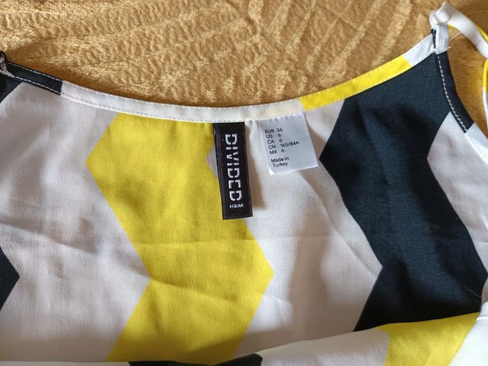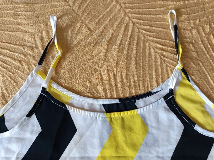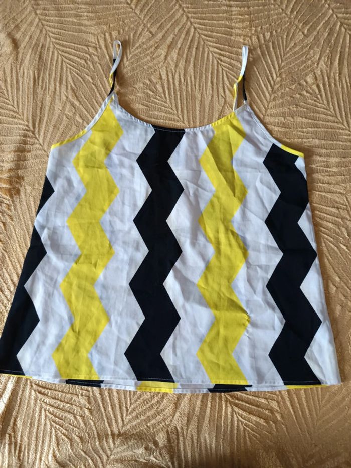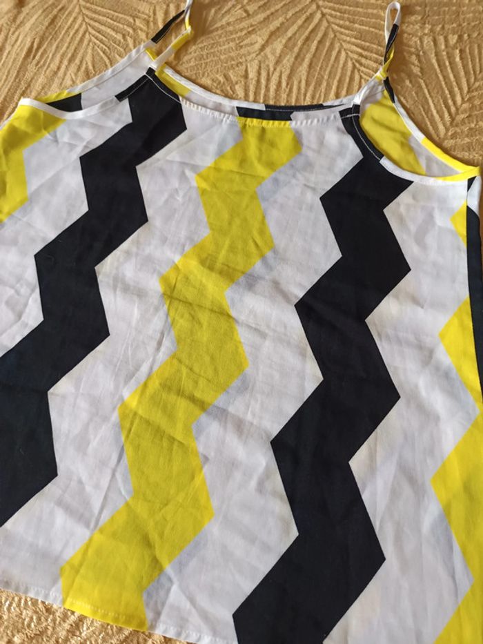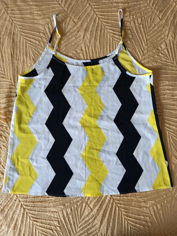 Débardeur ample blanc, jaune et noir, un peu transparent taille 36 H&M, très peu porté