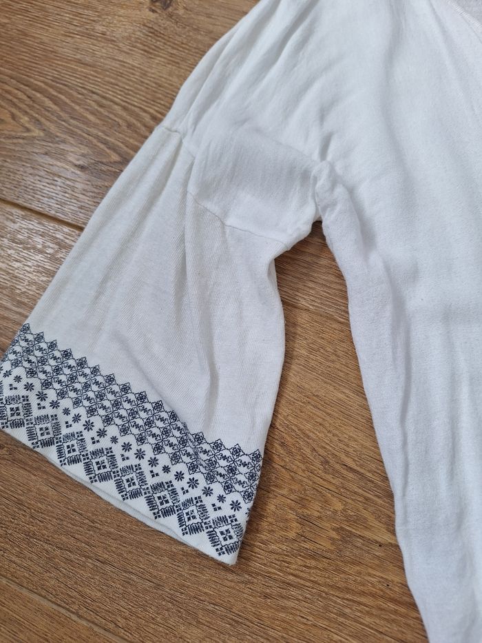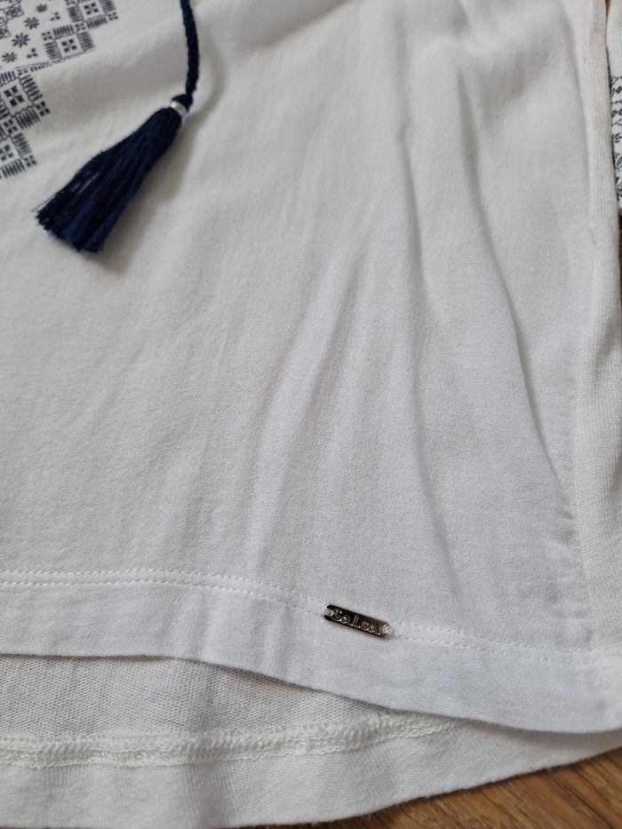 Haut manche 3/4 blanc avec motif bleu, petits lacets bleu sur le devant Marque Salsa Taille S Très bon état
