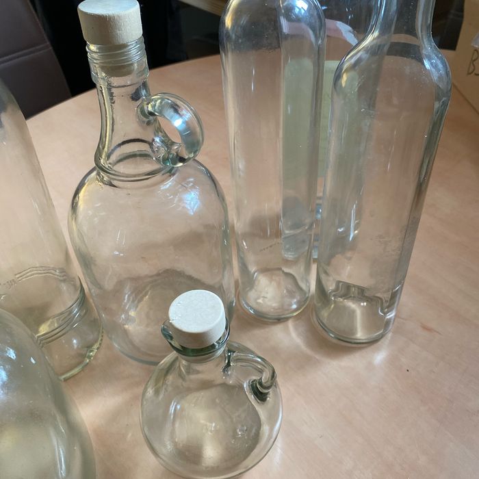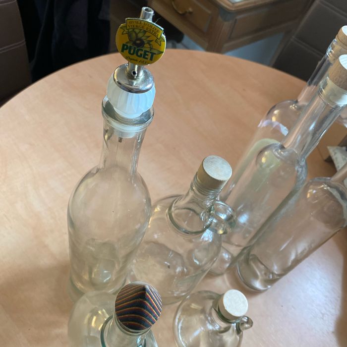 Lot 7 carafes verre avec bouchons bois et verseur huile