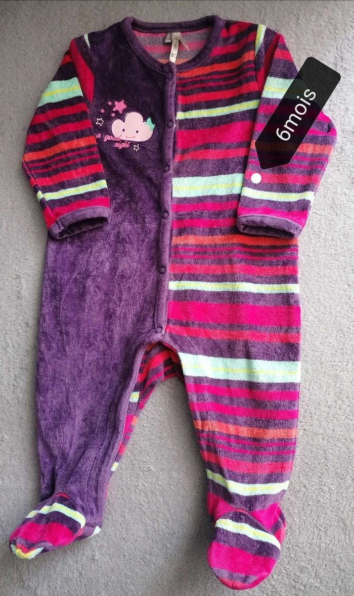 Grenouillère bébé filles Marque orchestra Age 6mois ( 67cm) Matière tissus velours Couleur : violet /Multicolore Portée, aucune tache 2.50€.