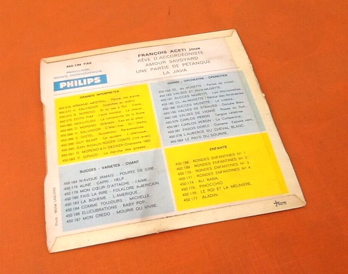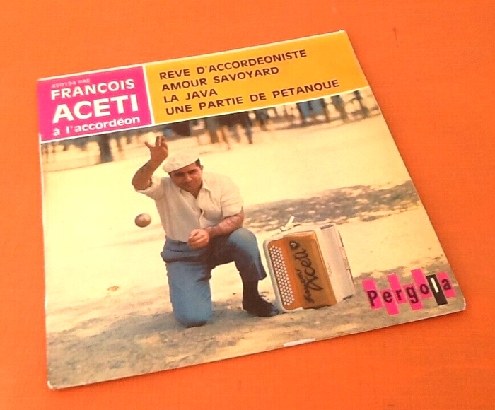 Vinyle 45 tours François Aceti Rêve d' accordéoniste (1966) Pergola 450194 A1 Rêve D'accordéoniste Written-By – M. Puig*, R. Dufas* A2 Amour Savoyard Written-By – F. Aceti*, E. Maillard* B1 Une Partie De Pétanque Written-By – A. Montagard*, L. Negre* B2 La Java Written-By – A. Willemetz*, J. Charles*, M. Yvain*