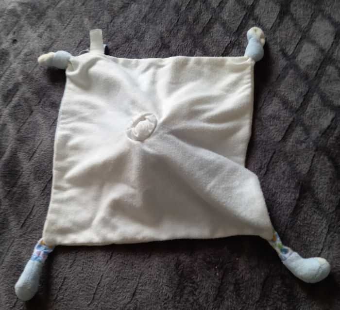 Doudou carré plat en velours de couleurs bleu ciel et crème et de l autre côté en tissu de couleur blanc Ours avec bonnet sur le milieu du doudou Feuilles vertes et spirales brodées sur le doudou 2 nœuds et 2 pattes sur les coins du doudou