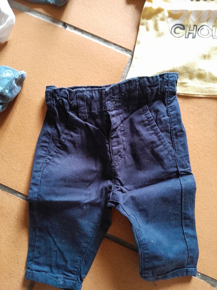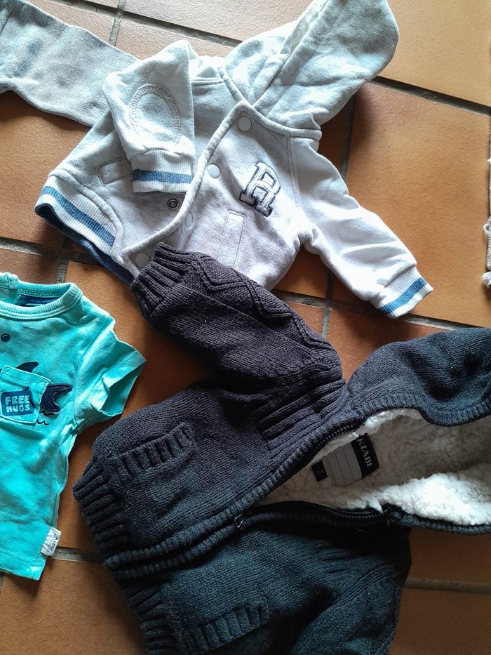 3 pyjamas (grenouillères) légers Verbaudet; 1 pull léger Kiabi; 2 tee-shirt kiabi, 1 pantalon léger kiabi; une veste légère H&M et un gros gilet chaud Kiabi