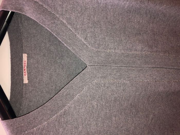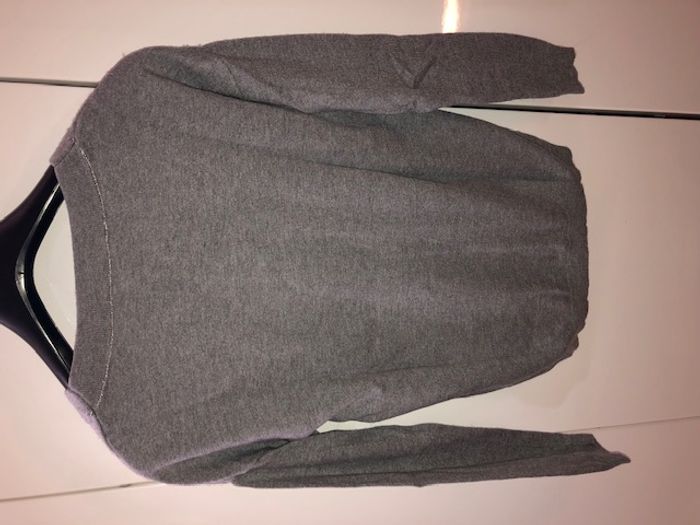 Pull fin gris clair avec col et longueur sur le devant rehaussés d'une couture en fil argenté Peut se porter seul ou sous un gilet largeur (sous bras) 46 cm longueur totale 54 cm manches 44 cm 45% viscose, 30% polyamide, 20% coton, 4% laine, 1% fibre métallisée Très bon état #anso92000_femme_36