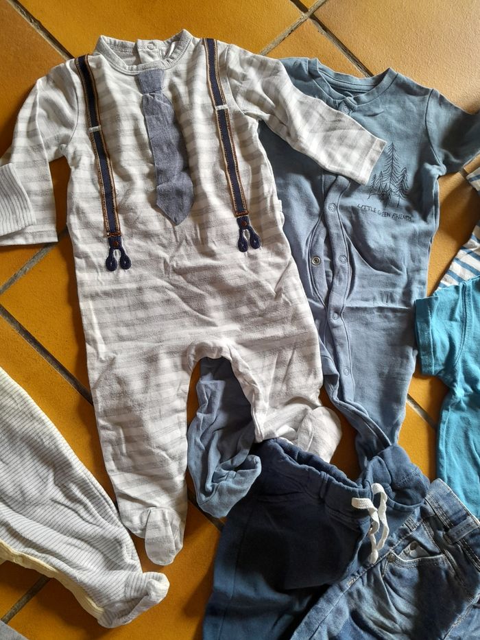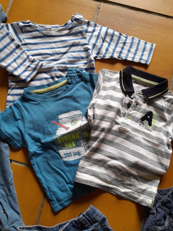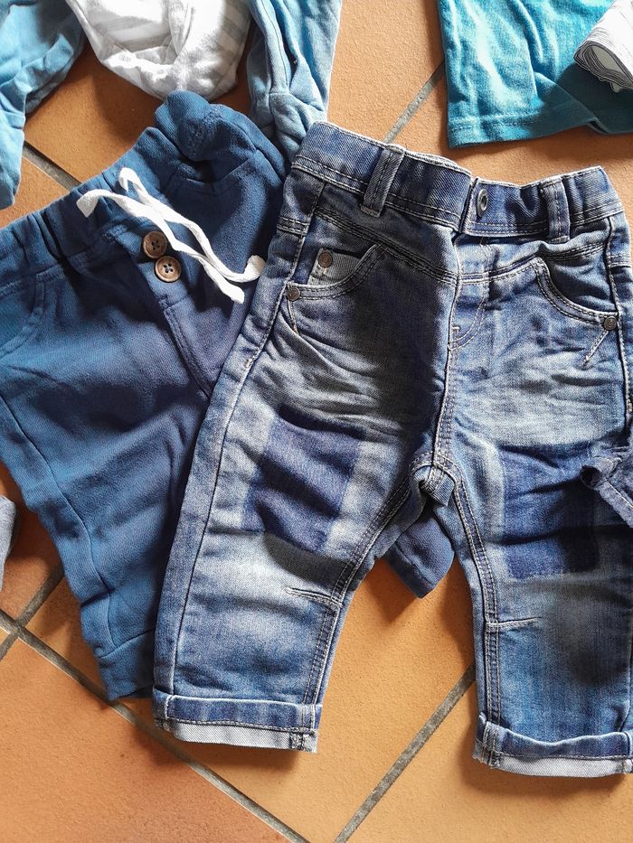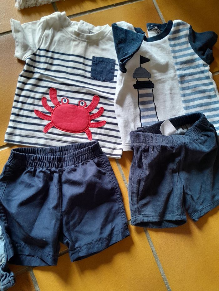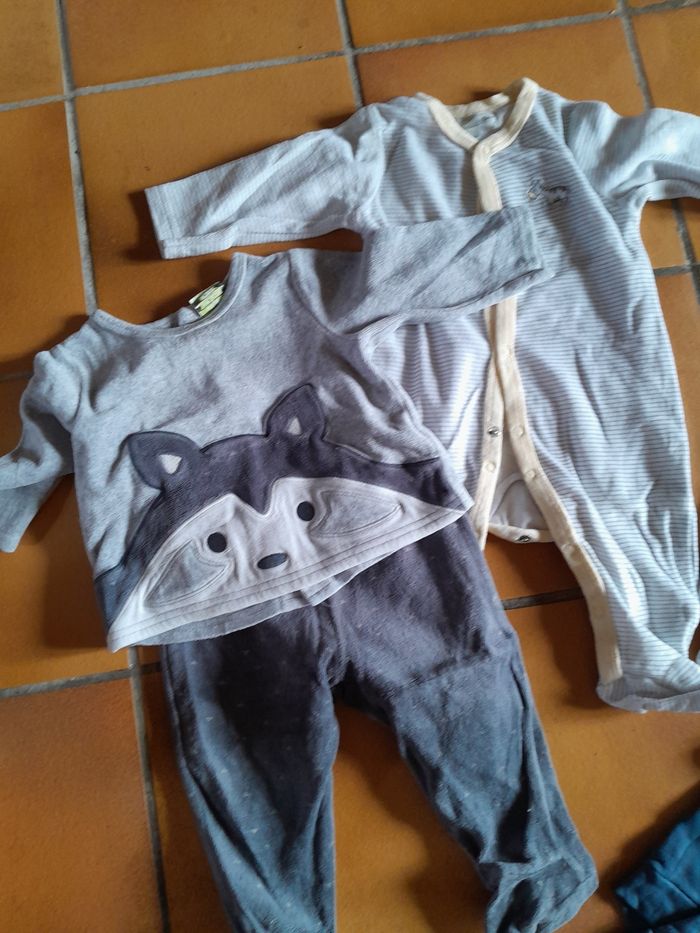 2 pyjamas velours (1 tape à l'œil, 1 mes petits cailloux); 2 pyjamas (grenouillères); 2 pantalons (dont 1 jean tape à l'œil); 1 body manche courte; 3 tee-shirts (1manche longue tape à l'œil, 2 Gemo); 2 ensembles tee-shirts/shorts style marin; une salopette Obaïbi