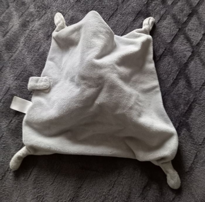 Doudou carré plat en velours de couleurs blanc,et gris avec motifs et de l autre côté en velours de couleur gris Lapin sur le milieu du doudou Attaché tétine sur le côté du doudou Lapin et étoiles argentés brodés sur le devant du doudou