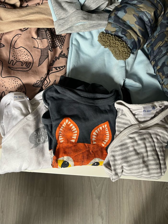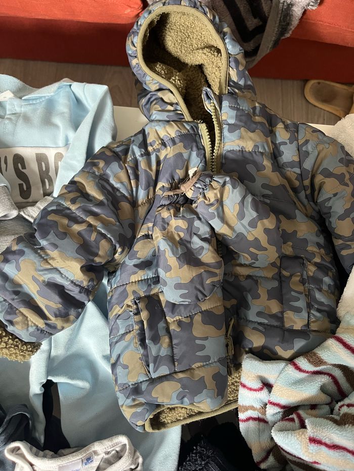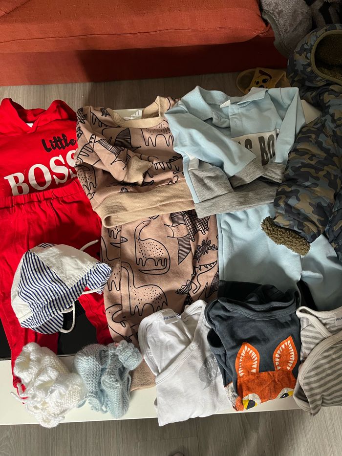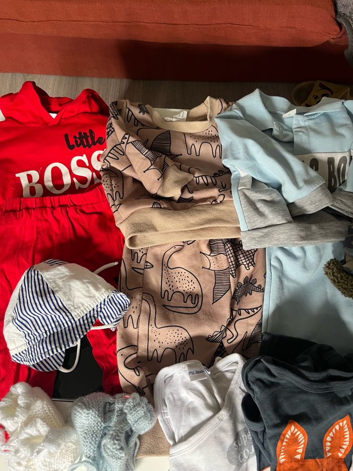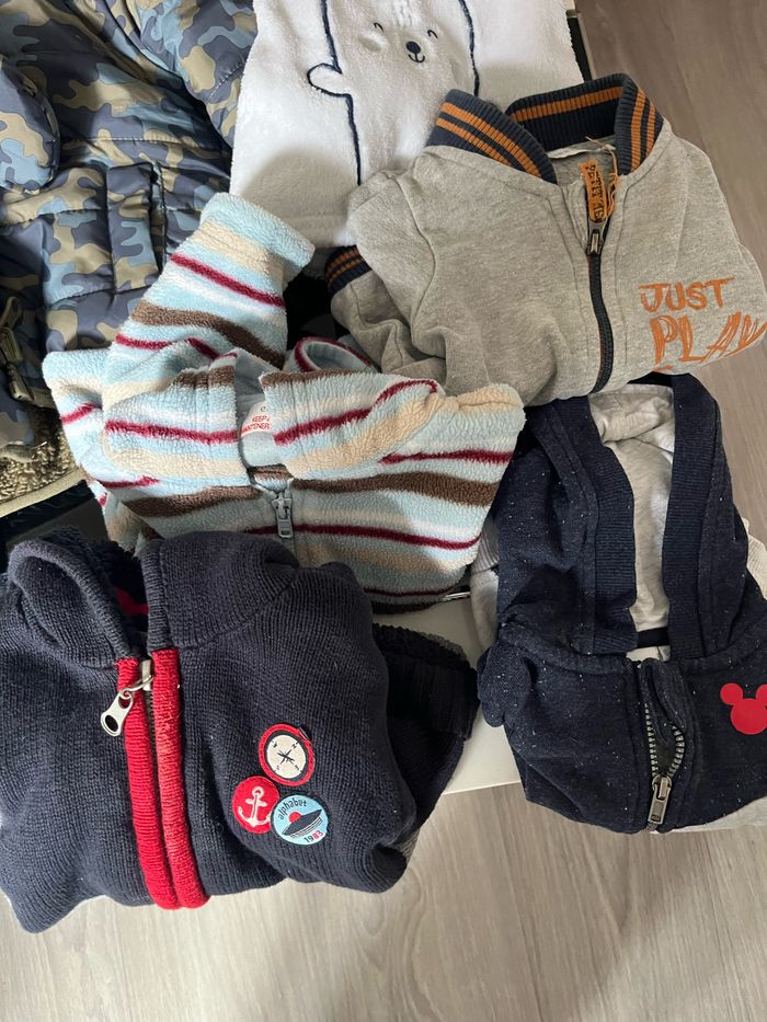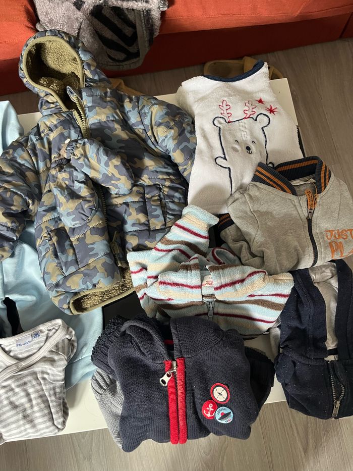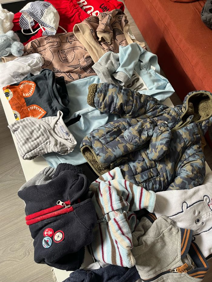 Dans le lot il y a : 3 ensembles manche longue Une casquette légère Deux paires chaussons tricotés mains 3bodys manche longue 4 veste dont 3 avec capuche une sans Un pull tout doux Une doudoune avec ses moufles