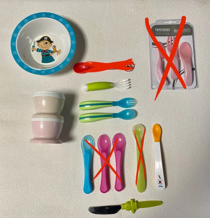 Lot vaisselle bébé Lot comprenant : 1 bol Des couverts : cuillères fourchette couteau Petit pot de transport #toutpourbebelatilma #accessoiresbebelatilma