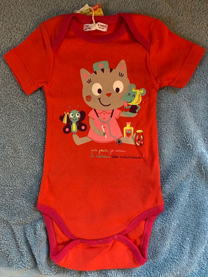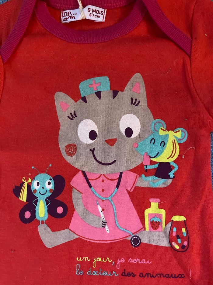 Superbe body motif chaton docteur Coloris rouge bordures fushia Taille 6 mois Neuf et étiqueté Non négociable Envoi rapide et soigné