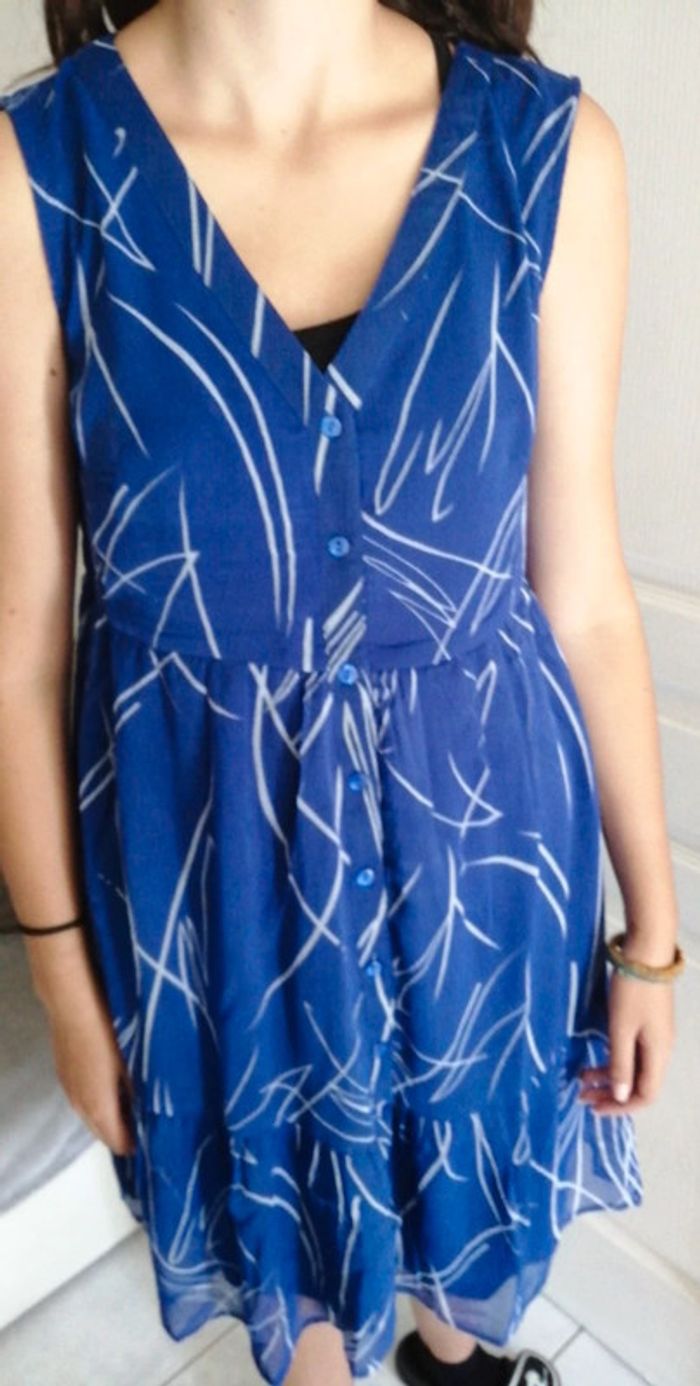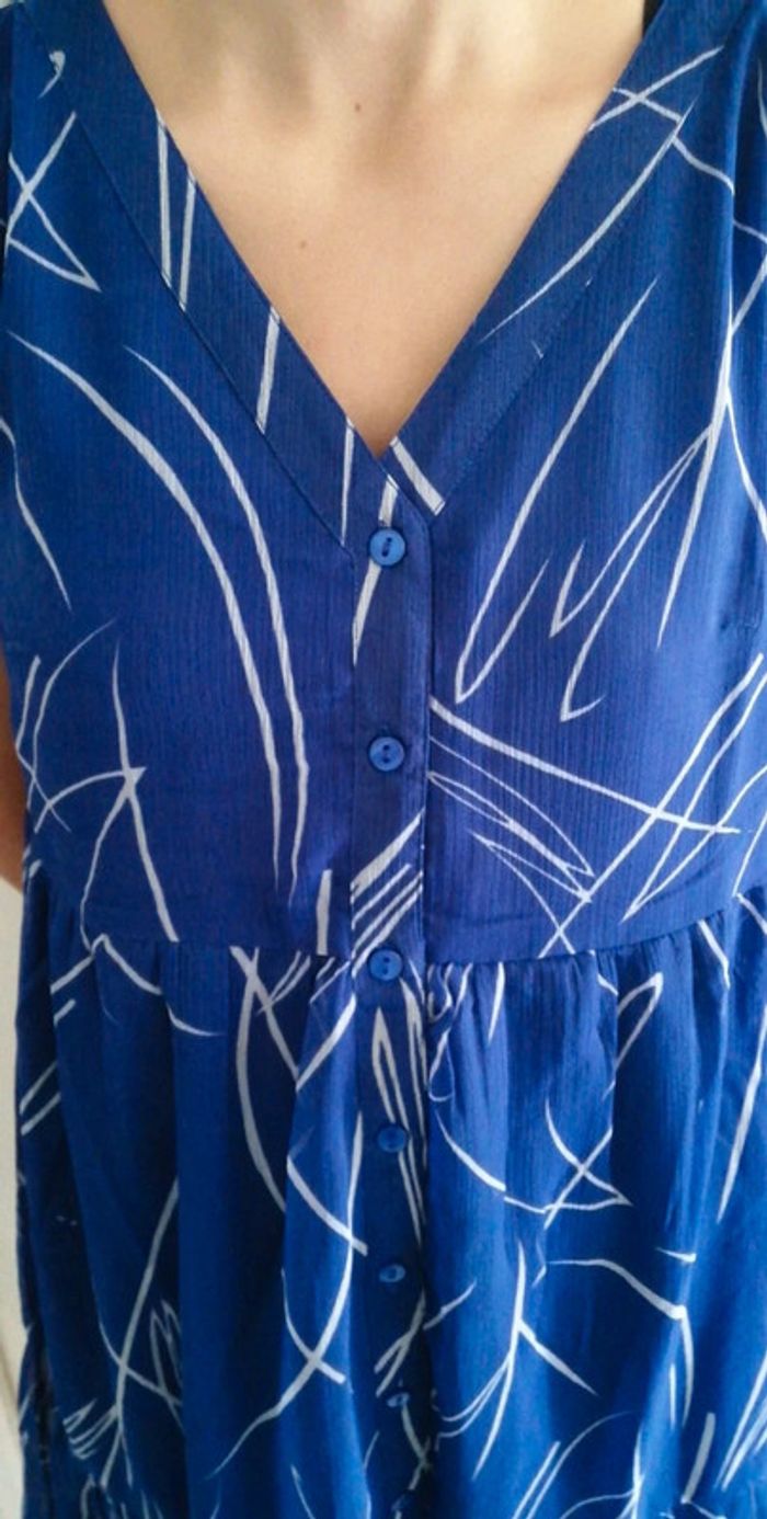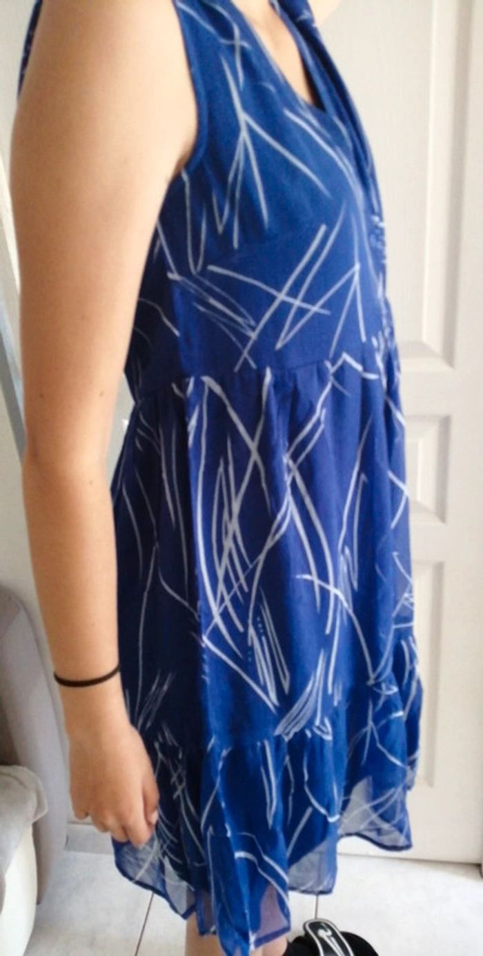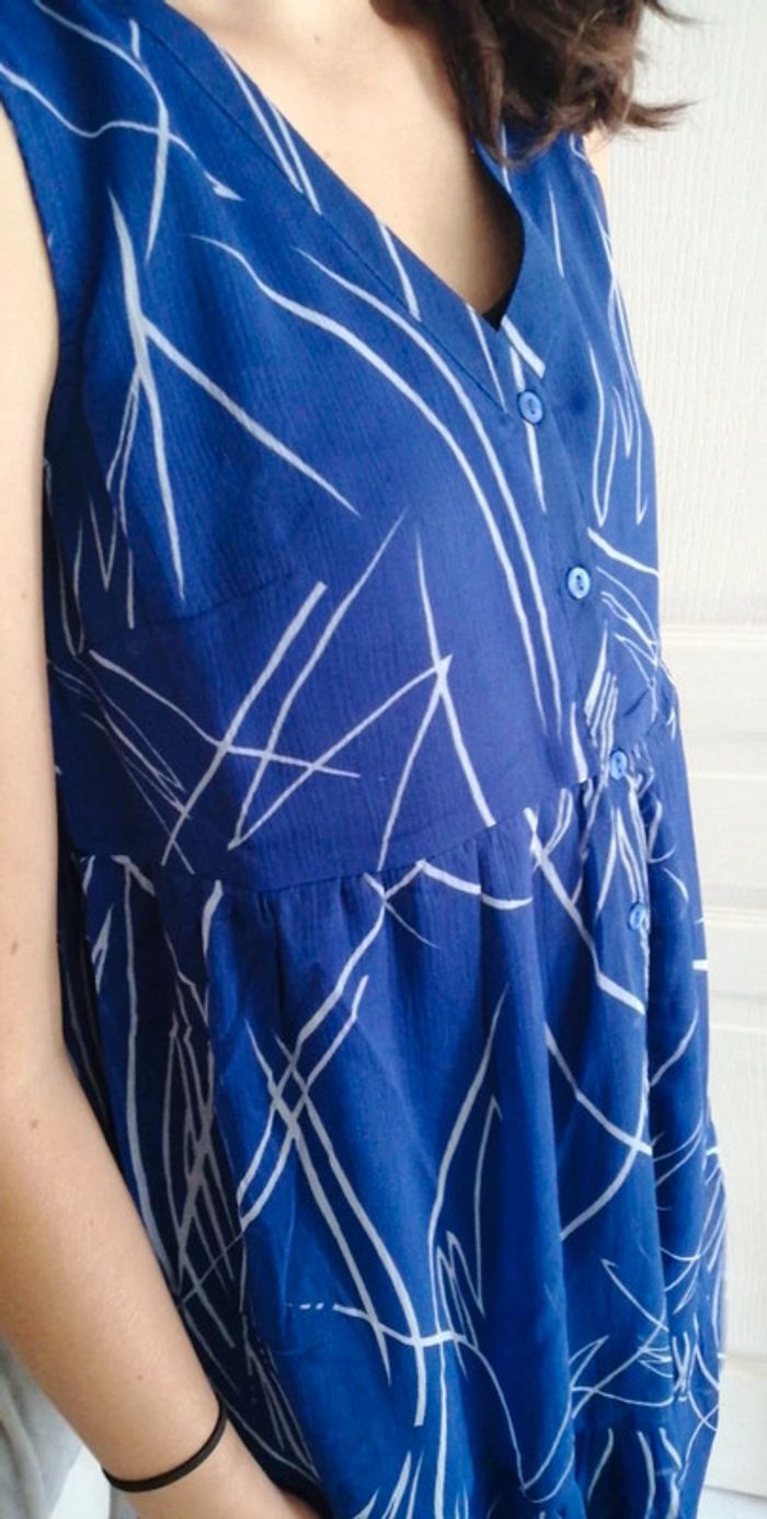 Très jolie robe volantée neuve (encore dans son emballage, juste portée pour la photo car ne convient pas à la personne à laquelle elle était destinée) Col V légèrement arrondi Entièrement boutonnée devant Pinces poitrine pour plus d'aisance Coupe évasée flatteuse sans manches Découpe sous poitrine avec 2 volants froncés dessous Voile léger (et doublé) agréable à porter Longueur : 98 cm environ. Voile imprimé 100% polyester Doublure en maille 100% polyester Achetée 30 € #articlesneufseilsel0 #robefemmeeilsel0 #hautfemmeT38eilsel0