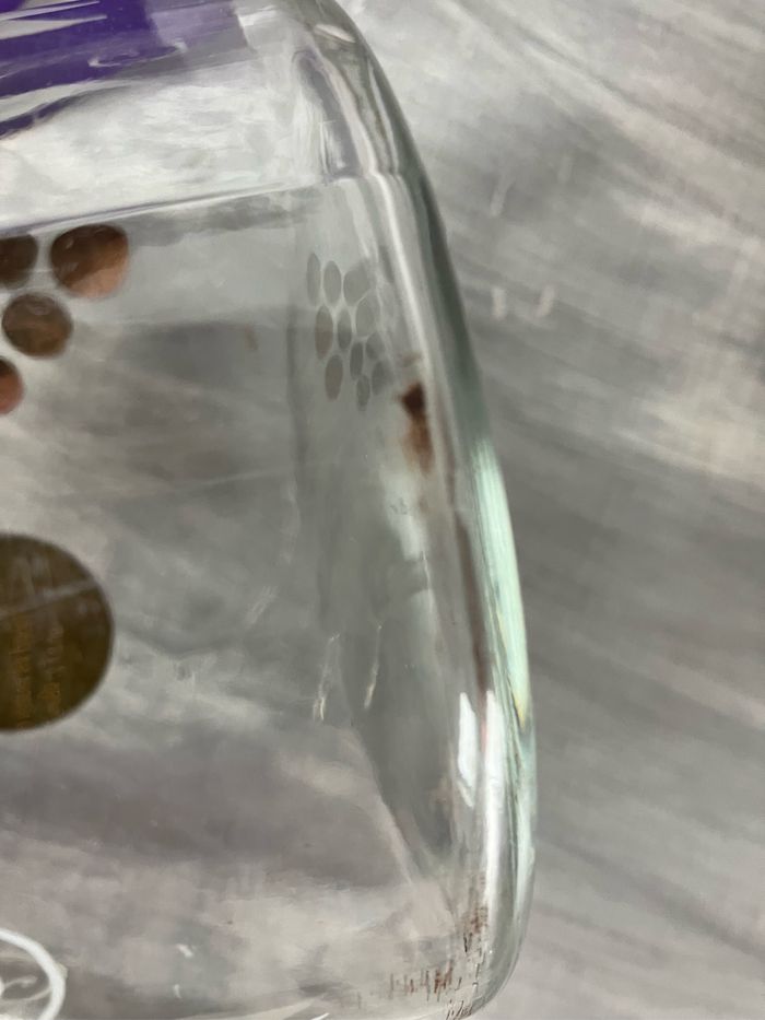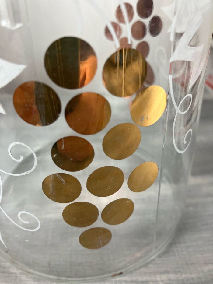 Vintage (années 80) pichet de la marque Luminarc En bon état, pas de casse ni de fêlures ⚠️ Quelques traces du temps sur les motifs mais ne nuisent pas au visuel Imprimés grappes de raisin doré et fleurs finement blanches dessinées Carafe : 21 cm de haut et 9 cm de diamètre