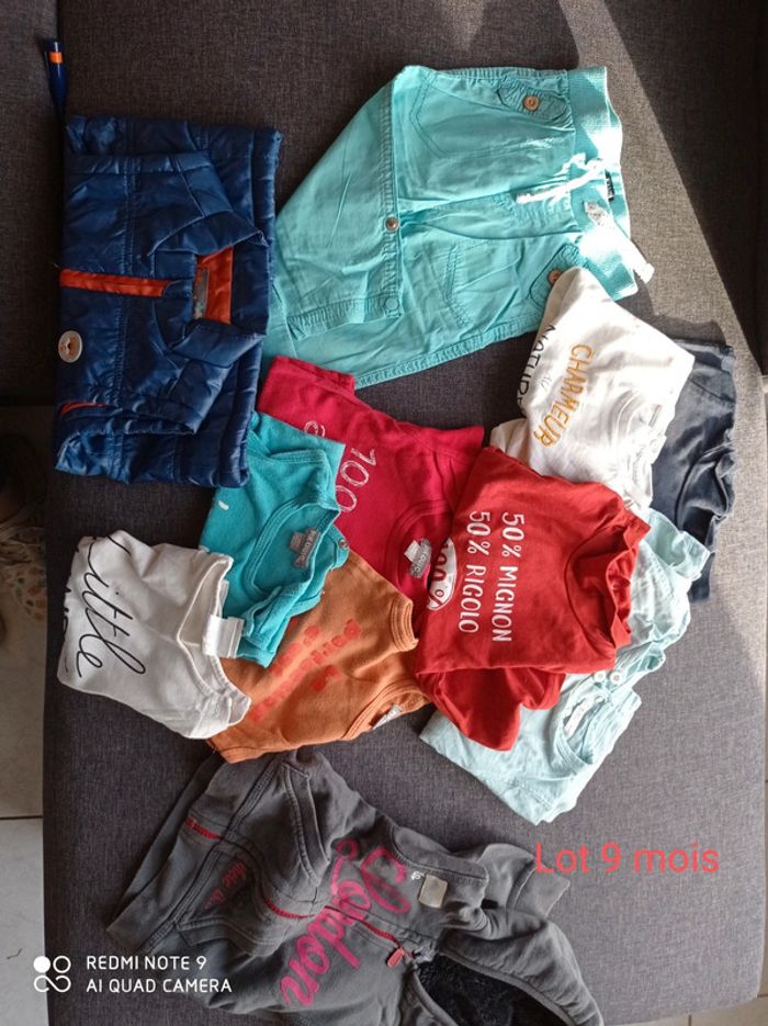 Lot 9 mois Composez de: 4 hauts manche longue 1 pantalon fin ( se remonte avec pression pour faire panta cours) 3 bodys 1 t shirt 1 veste 1 doudoune sans manche 11 vêtements