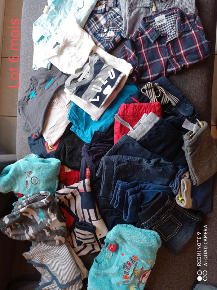 Lot 6 mois Composez de : 3 chemises + 1 chemise manche courte 9 hauts manche longue 8 pantalons 2 ensembles 3 bodys 1 pull et 1 gilet 28 pièces