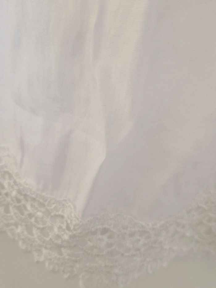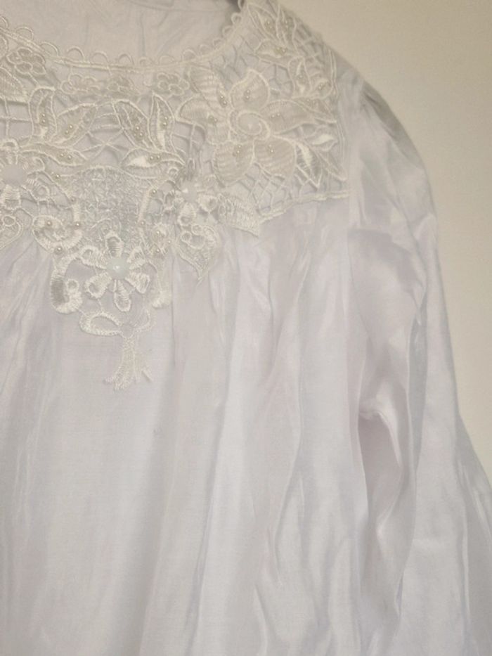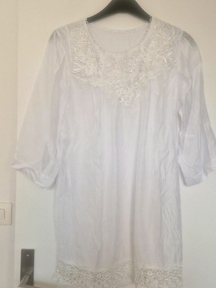 Jolie tunique blanc satiné avec dentelle et perles décoratives En très bon état Manches 3/4 Taille unique idéale pour du 40 - 42
