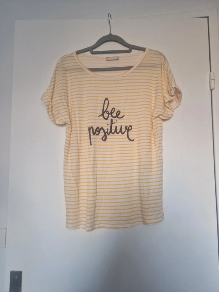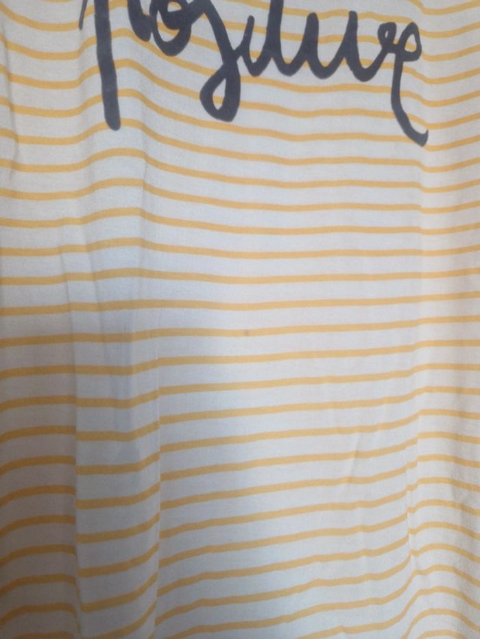 Haut rayé avec message sympa Très bon état. Juste une micro tache très peu visible (cf photo) d'or le petit prix Matière fluide et légère