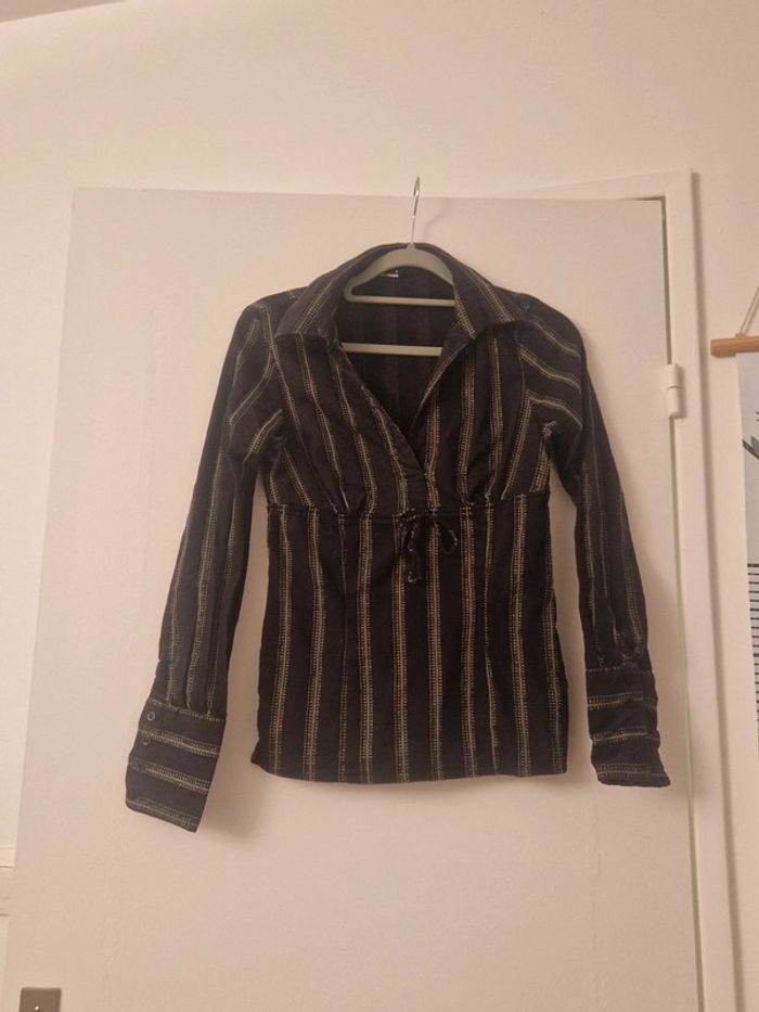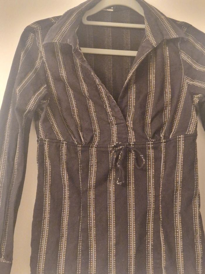 Très jolie chemise Zara, élégante et féminine tout en étant facile à porter. Noire avec fines rayures blanches et dorées Matière légèrement stretch Lien taille à ajuster Beau décolleté en V Comme neuve. Rarement portée
