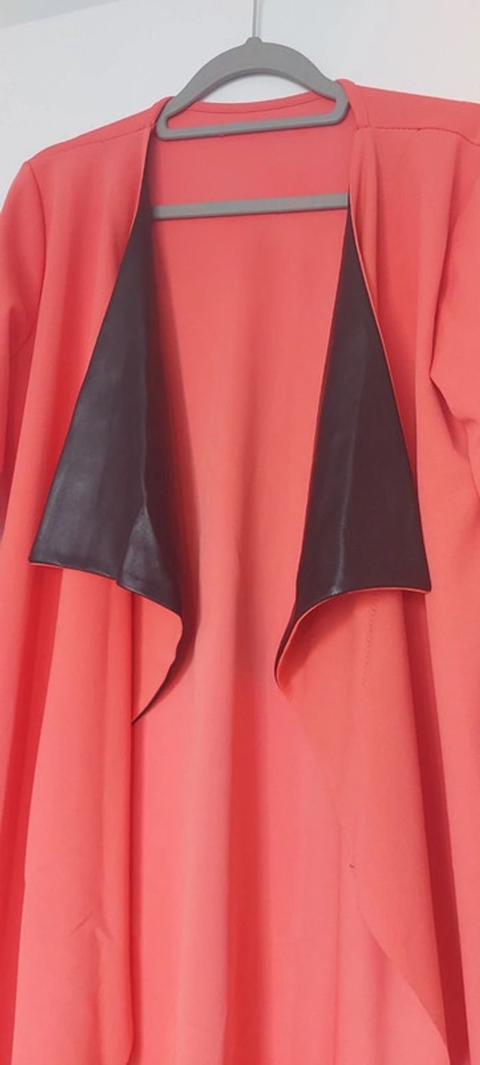 Jolie veste corail avec empiècement simili cuir noir sur le col Longueur en dessous des fesses (pour 1m60) Matière polyester et elasthane Fabrication française Taille unique idéale pour du 38 ou du 40 Neuve sans étiquette