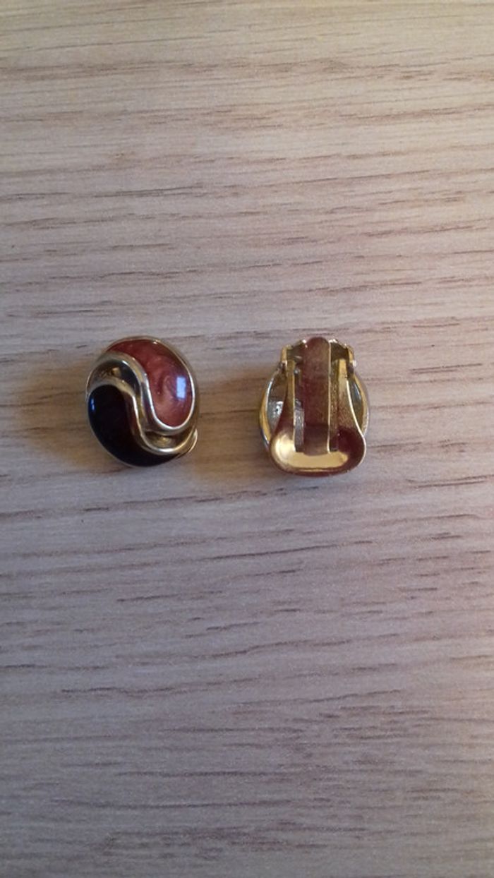 Elégante paire de boucles d'oreilles vintage, dorée, noir et ambre. Motif yin/yang. Clipsable. Très bon état.