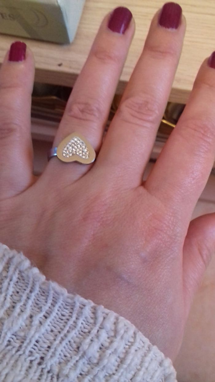 Jolie bague fantaisie en forme de coeur, argentée, avec mini strass au centre. Ajustable (pour info, ma taille est du 52). Comme neuve (portée une fois)